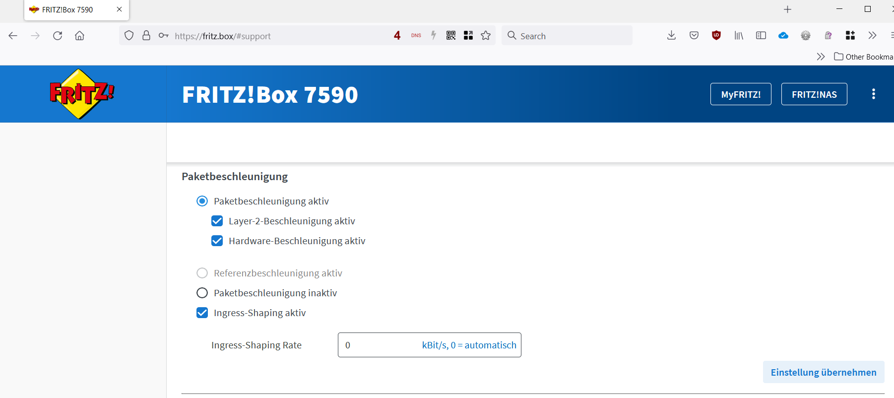 Meine 7590 hat es: Links im Menü auf "Hilfe und Info" und dort auf "FRITZ!Box Support" klicken. Unter "Paketbeschleunigung" kann man dann "Ingress-Shaping aktiv" aktivieren:Engaged schrieb:Bei der extremen Flut auf allen Webseiten zu jeden einzelnen Labor Furz kann ich die Meldung zu priorisierten eingehenden Traffic leider nicht mehr finden. 🤣