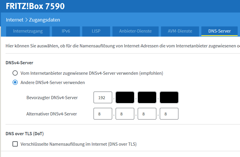 Das geht genauso, hab ich selbst gerade umgestellt um das zu testen. Jacke wie Hose und wenn das Pihole mal ausfällt, sollte die Fritte auf den 2. Eintrag zurückfallen. So sollte es ja gedacht sein, oder nicht? Trägt man es unter den Netzwerkeinstellungen bei DHCP als DNS ein, hat man ja gar keinen DNS-Server mehr, wenn das Pihole mal down sein sollte. Ansonsten weiß ich nicht was Du mit "lokale Netz" meinst, alles was an der Fritz!Box hängt ist lokales Netz...cloudman schrieb:Nein er meint DNS für das lokale Netz.