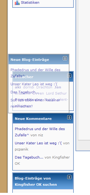 Meine einfach Idee wäre, die Unterforen nach eigenen Wünsche verschieben zu können. Dazu könnte man an die linke Seite (wie im Blog) ein kleines Symbol machen an dem man sich die Unterforen "hinschieben kann wo man will". Hier auf dem Screenshot kann man die "Aero-Verschiebung" erkennen: