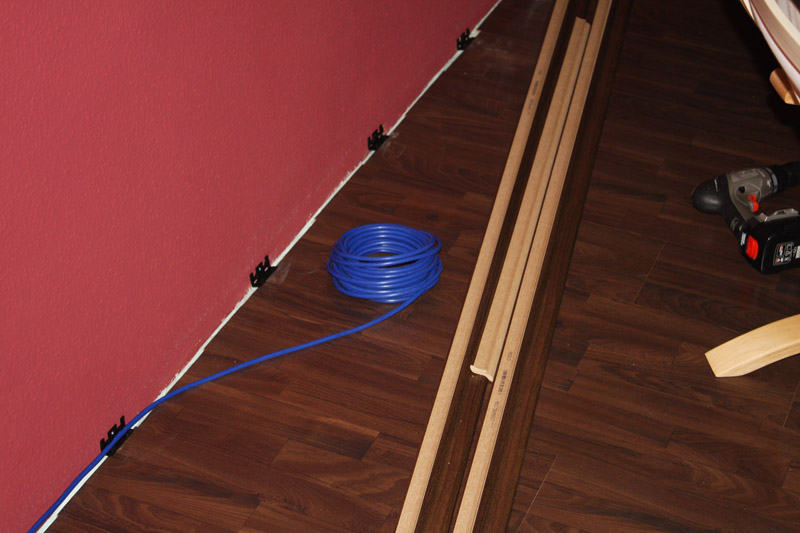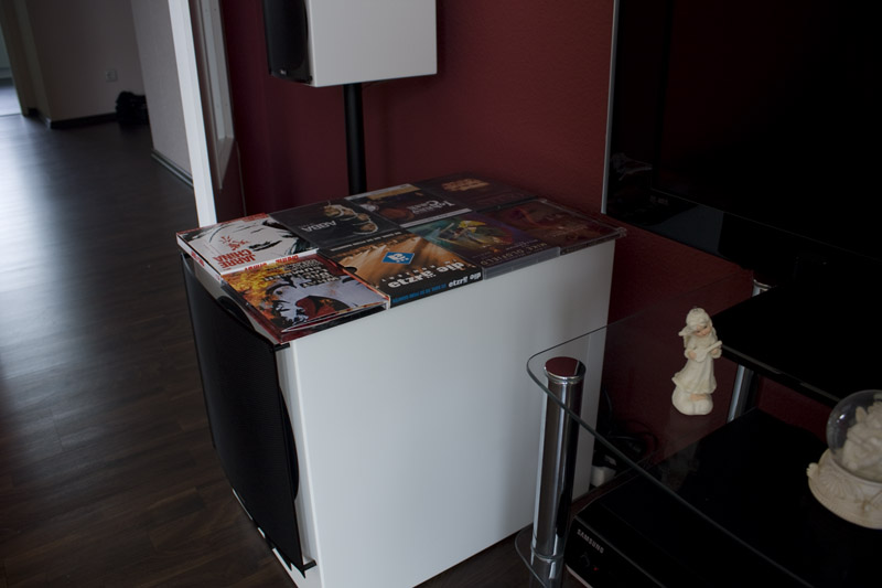 Obwohl der Subwoofer auf den Bildern noch recht überschaubar aussieht, hat auch er eine nicht zu unterschätzende Größe. Ich habe versucht, das mal mit einigen DVD-Hüllen zu demonstrieren. Exakt 8 davon können seine Grundfläche ganz gut abbilden. Aus diesem Grund hat der Subwoofer langfristig auch keinen Platz mehr zwischen den Fronts. Wenn dort ein TV-Unterteil hinkommt, passt es räumlich einfach nicht mehr. Er wird stattdessen an eine Seitenwand wandern (ob das akustisch nicht völlig daneben geht, hoffe ich einfach mal). Das entsprechende Kabel habe ich direkt einmal an drei Wänden entlang gelegt.