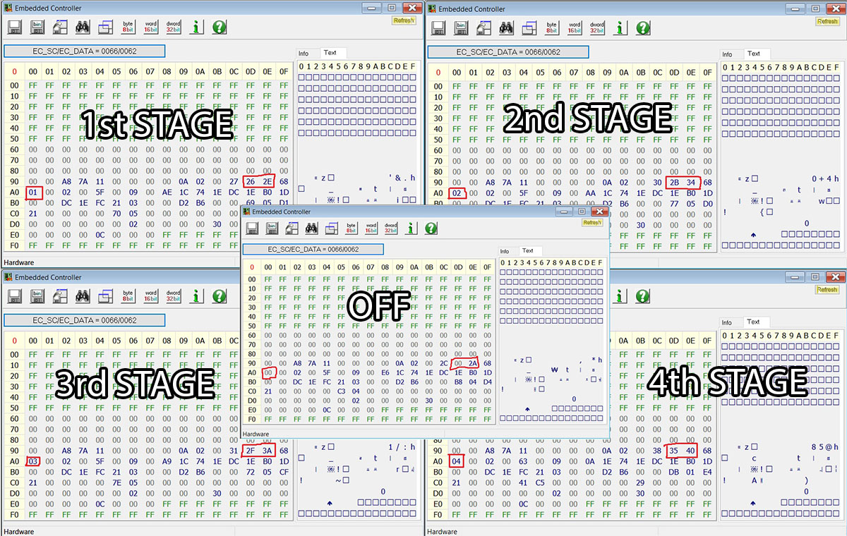 Lets say I directly write in the EC table when the fans are working on level 1, in the EC table the values are 01 (1st level) --> 26 2E. I change the 01 value to 00, I can hear the fan on the left side shutting down, but the "26 2E" values dont change in the table and I can hear the fan on the right side is still working on level 1. But if I try to manually change the "26 2E" values to its OFF state ("00 2A"), nothing happens.