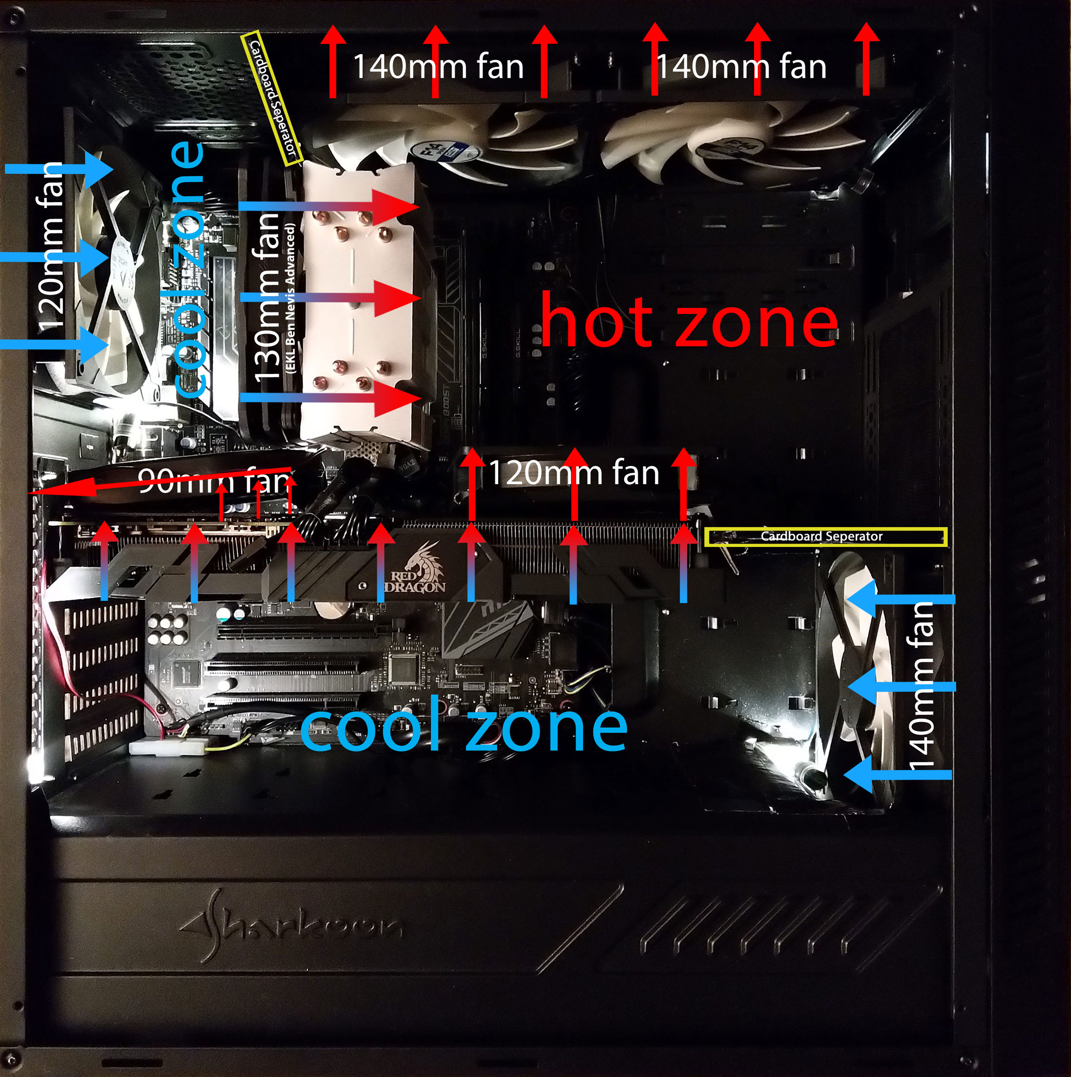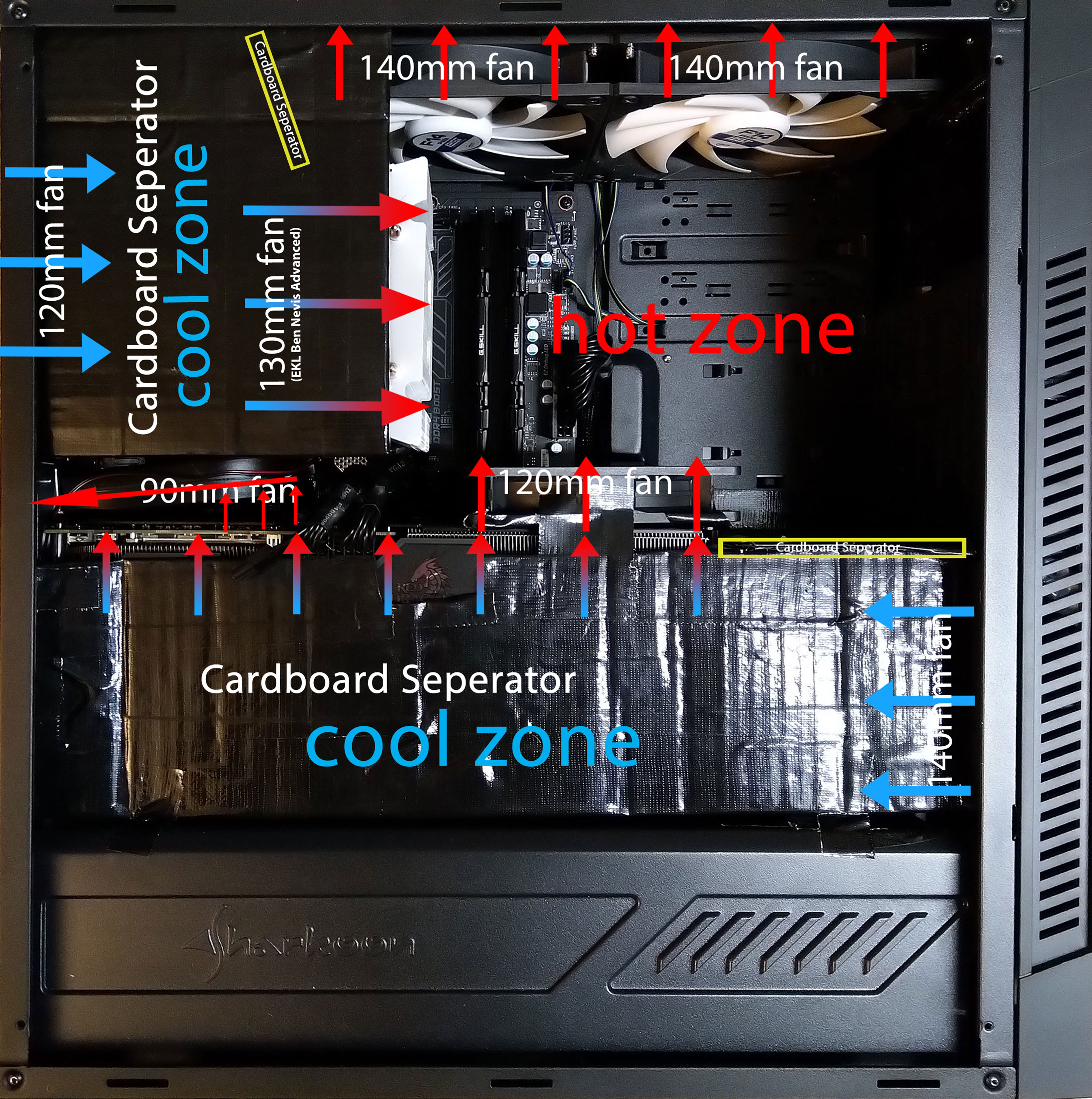 Gelungen ist dies durch eine Teilung des Gehäuses in kalte und warme Zonen. Dabei werden diese Zonen mithilfe von Pappe voneinander getrennt um einen sauberen Luftstrom zu gewährleisten.