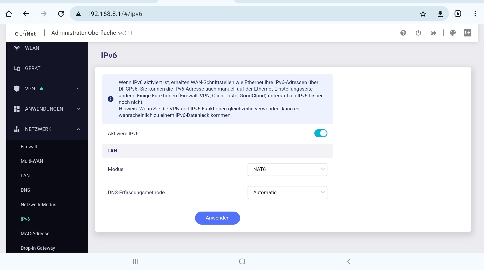 Am gl inet gibt es die Option ipv6 zu aktivieren. Habe das gema ht und stehe immer noch vor dem selben Problem - kein internet verfügbar.