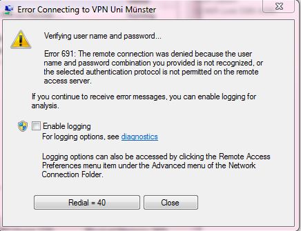https://zivwiki.uni-muenster.de/bin/view/Anleitungen/PPTPVPNSetupWinVista Soweit so gut. Eingerichtet habe ich meines Wissens alles, aber wenn ich nun verbinden möchte, erscheint folgende Fehlermeldung: (siehe Anhang)