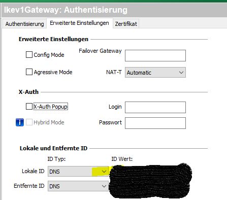 hab eine funktionierende VPN IPsec mit Ikev1 Authentisierung (FQDN) Verbindung zu meinem VPN Server (TP-Link Safestream TL-R600VPN). Hier kann ich mich z.Bsp. mit dem VPN Client GreenBow via Laptop ohne Probleme "einwählen". Hier verwende ich die Lokale und entfernte ID.