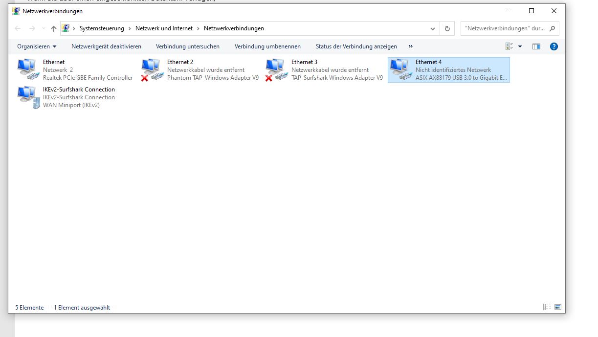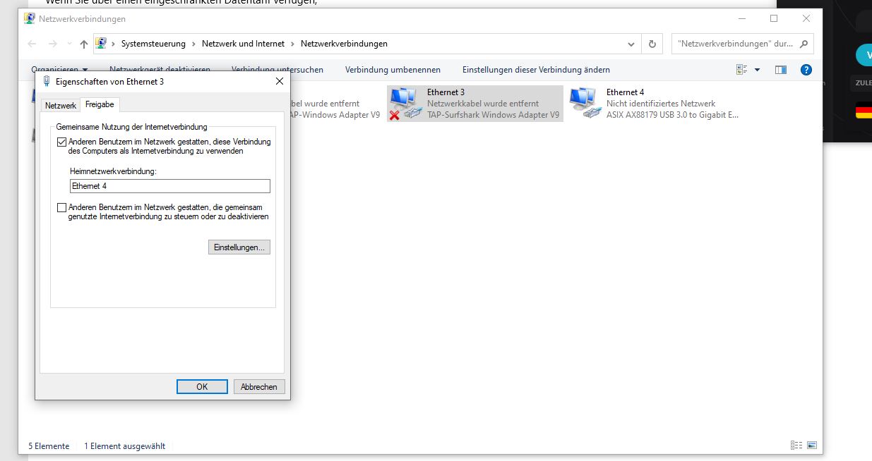 Habe die Freigabe erteilt von Ethernet 3 was von Surfshark ist das es auf die PS4 (Ethernet4) weitergeleitet wird, Ps4 habe ich auf Automatisch IP Abruf eingestellt und Ethernet 4 auch auf automatische IP einstellt, sowie auf dem Screenshot gepostet aber es tut sich nichts, was mache ich falsch warum erkennt Ethernet4 (PS4) nicht?!