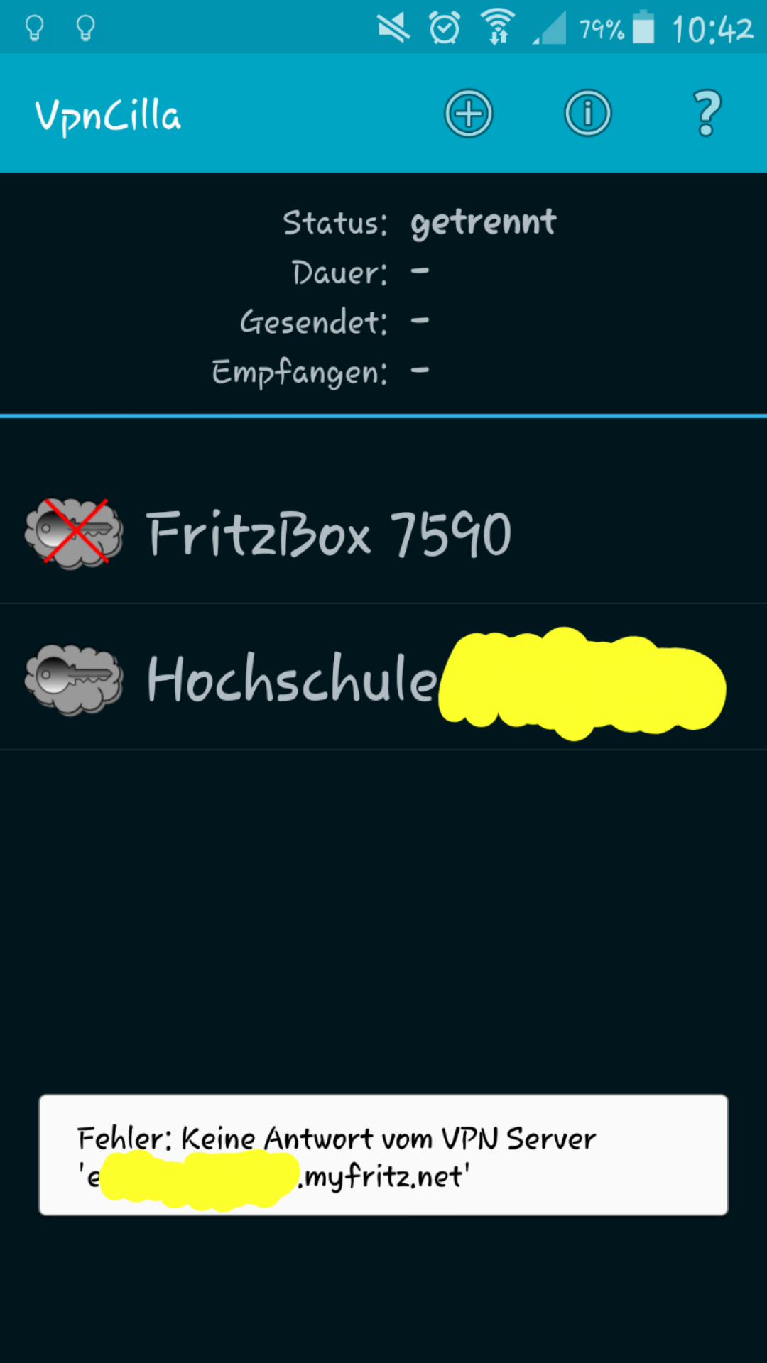 Ich weiß das VPN-Verbindungen nach extern im Router blockiert werden können - aber dann dürfe ich mit meinem Laptop ja auch keine Verbindung mehr aufbauen können. Ich hatte bis vor ~2 Jahren mit dem integrierten Amdroid-Clienten nie Probleme an der Hochschule. Dann lief der plötzlich nicht mehr und ich habe VPNCilla gekauft - damit ging es ohne Probleme, bis es seit ein paar Wochen auch damit nicht mehr läuft.