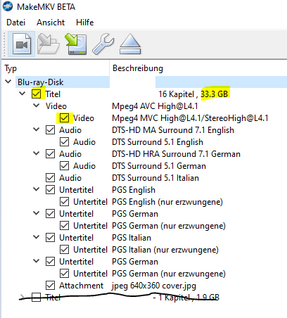 3. Nur den größten Titel auswählen, das ist der 3D Blu-Ray Rip, alles andere kannst du wegklicken, der Haken bei Video muss bewusst gesetzt werden.