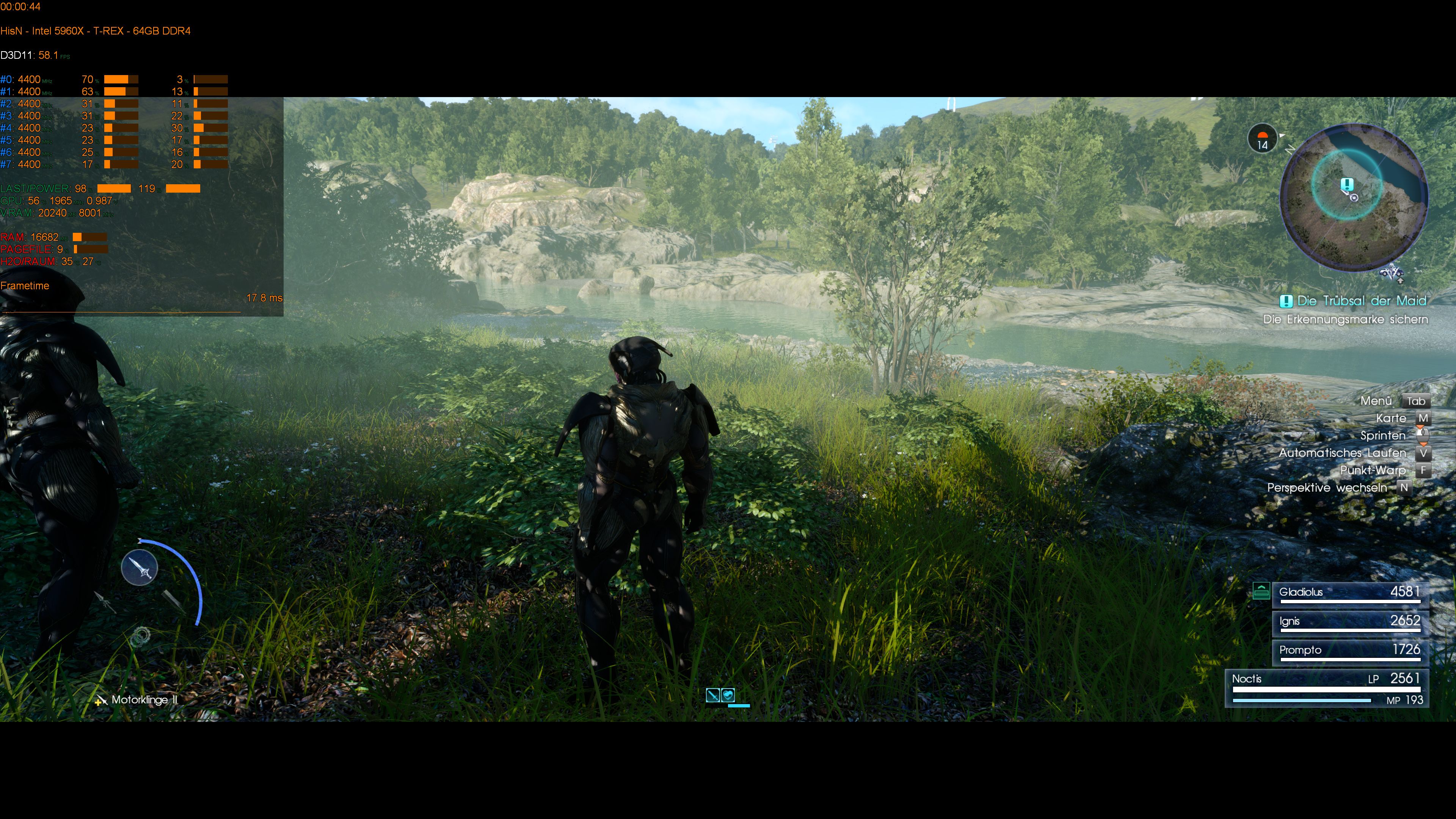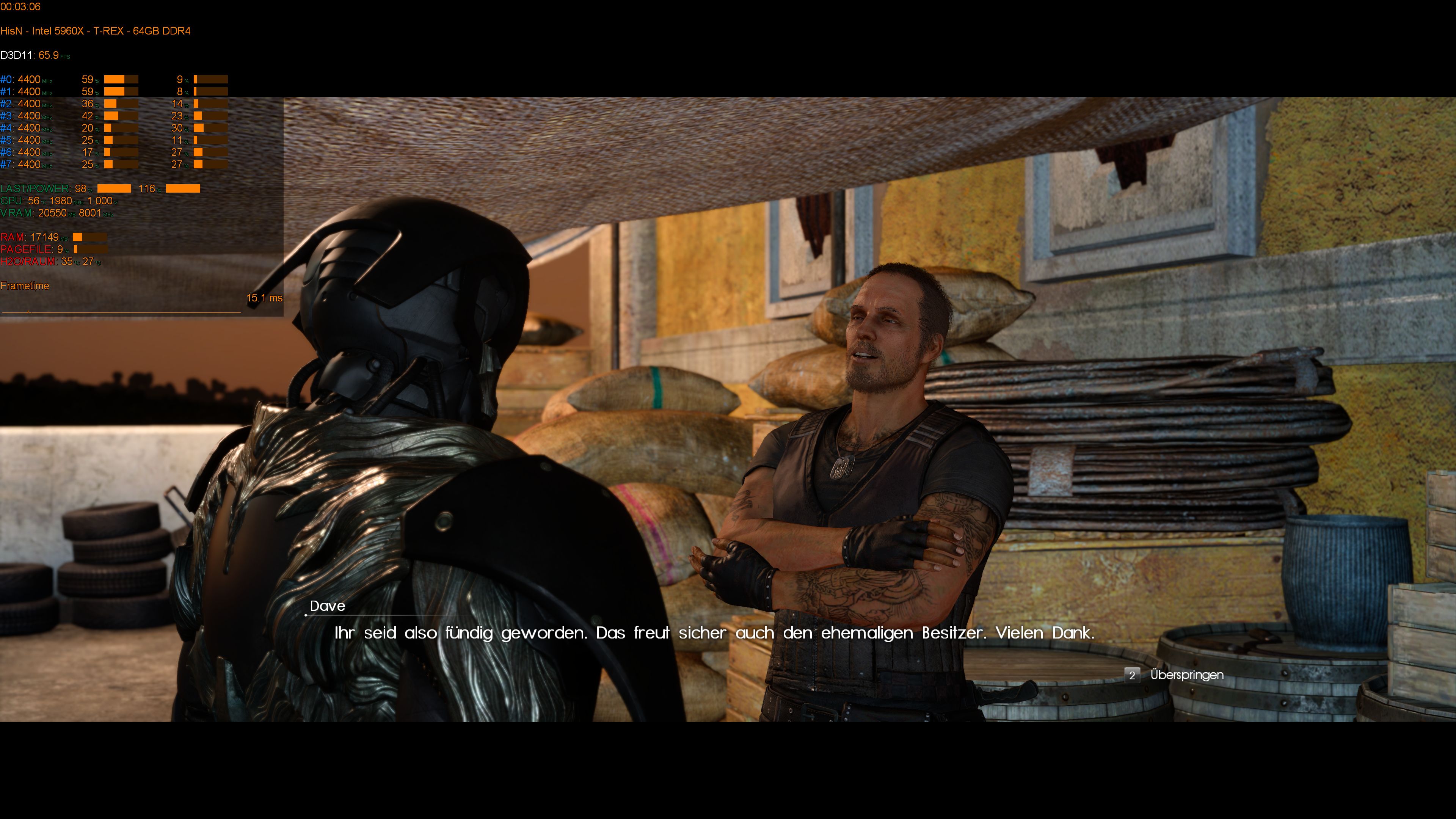 Das Ergebnis darf zu denken geben. Man sieht genau was mit den FPS passiert und wie das fehlende VRAM vom System kompensiert wird. Ich verliere ganze 10 FPS und die RAM-Belegung steigt um 3GB.