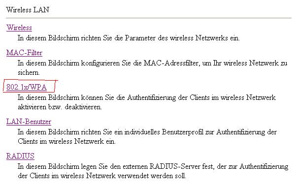 Einfach aktivieren geht nicht, ich muss einen Wireless LAN - RADIUS Authentifizierungs-Server aktivieren, doch isch habe keine Ahnung wie ich das einstellen soll geschweigen denn, wie das dann weiter mit dem WPA und später an meinem Laptop gehen soll! Scheint jedenfalls alles sehr viel komplizierter zu sein, als mit dem WEP. Vielleicht unterstützt meine W- Lan Schnitstelle am Lappi das WPA auch gar nicht?!