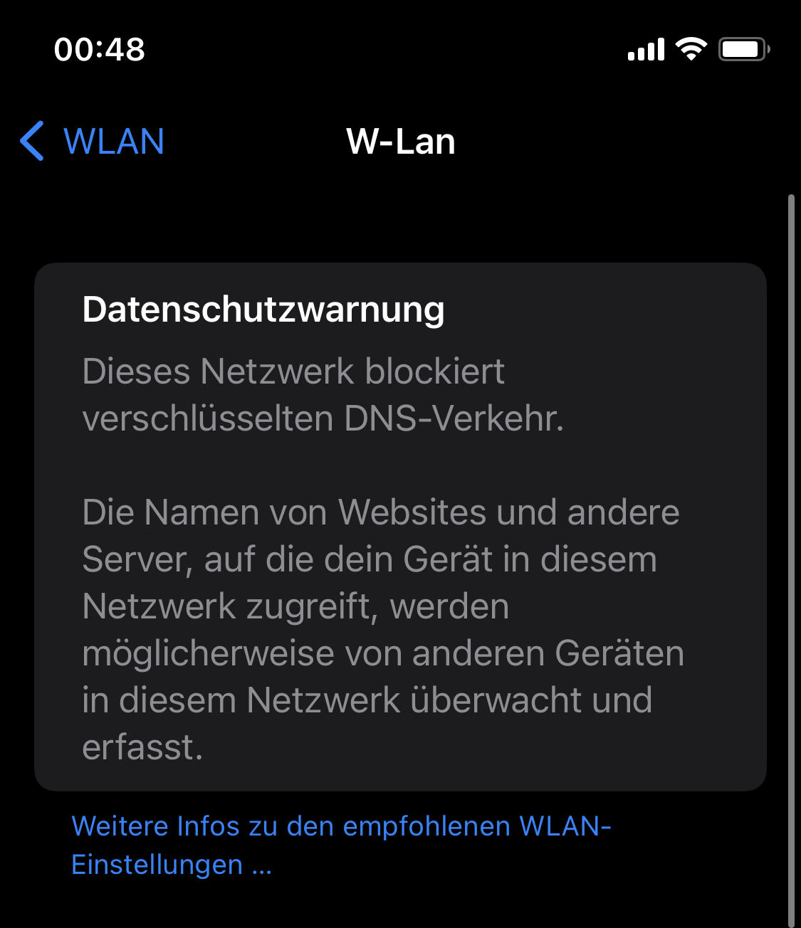 Ich kenne mich mit iOS leider null aus, aber eigentlich wird der DNS vom Router vorgegeben, weswegen die Meldung für mich keinen Sinn machen würde, wenn nicht manuell ein DNS angegeben wurde, welcher über DoH oder DoT läuft.