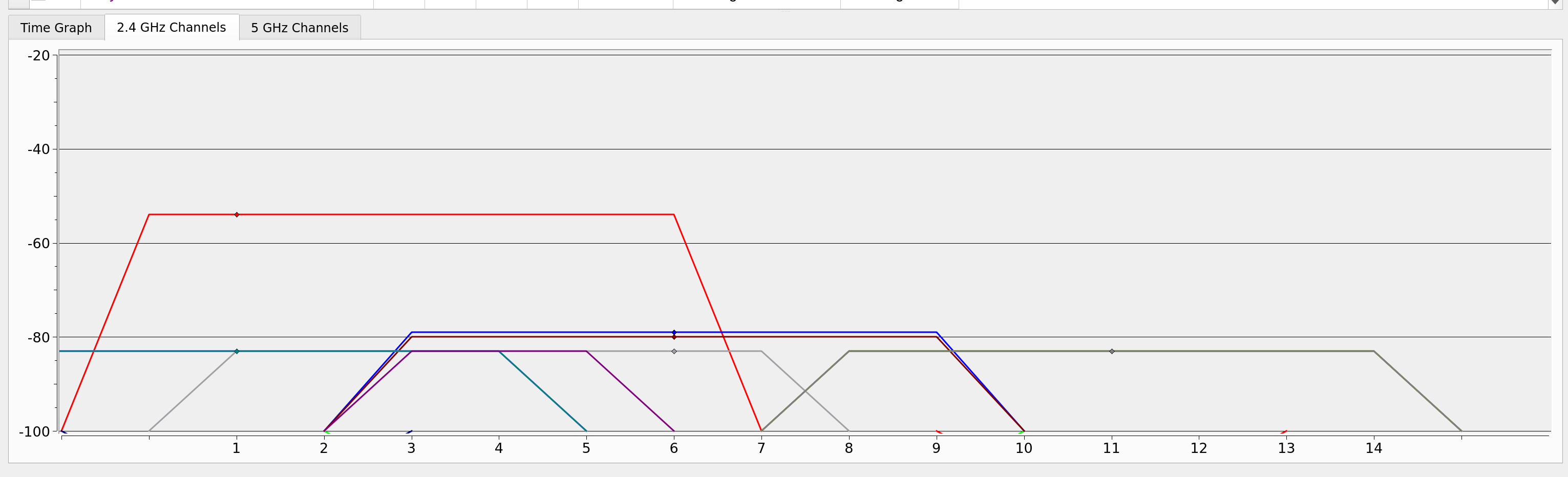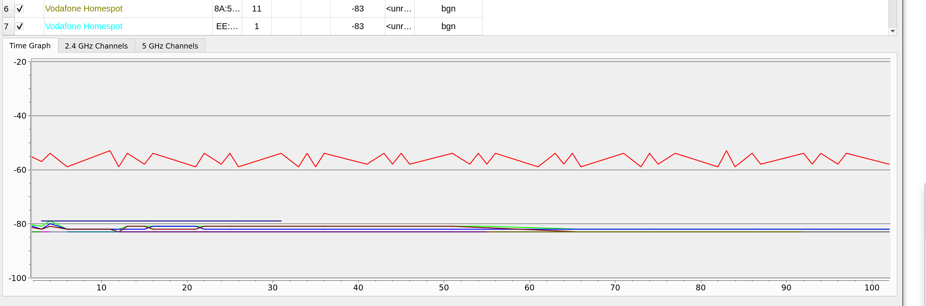 Hier ein Einblick in den Screenshot: Rote Linie ist mein eigenes WLAN, die anderen Linien die WLAN von Nachbarn.