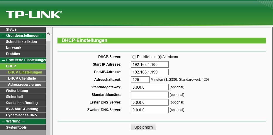 Der Adressbereich im TP-Link Router ist von 192.168.1.100 - 192.168.1.199