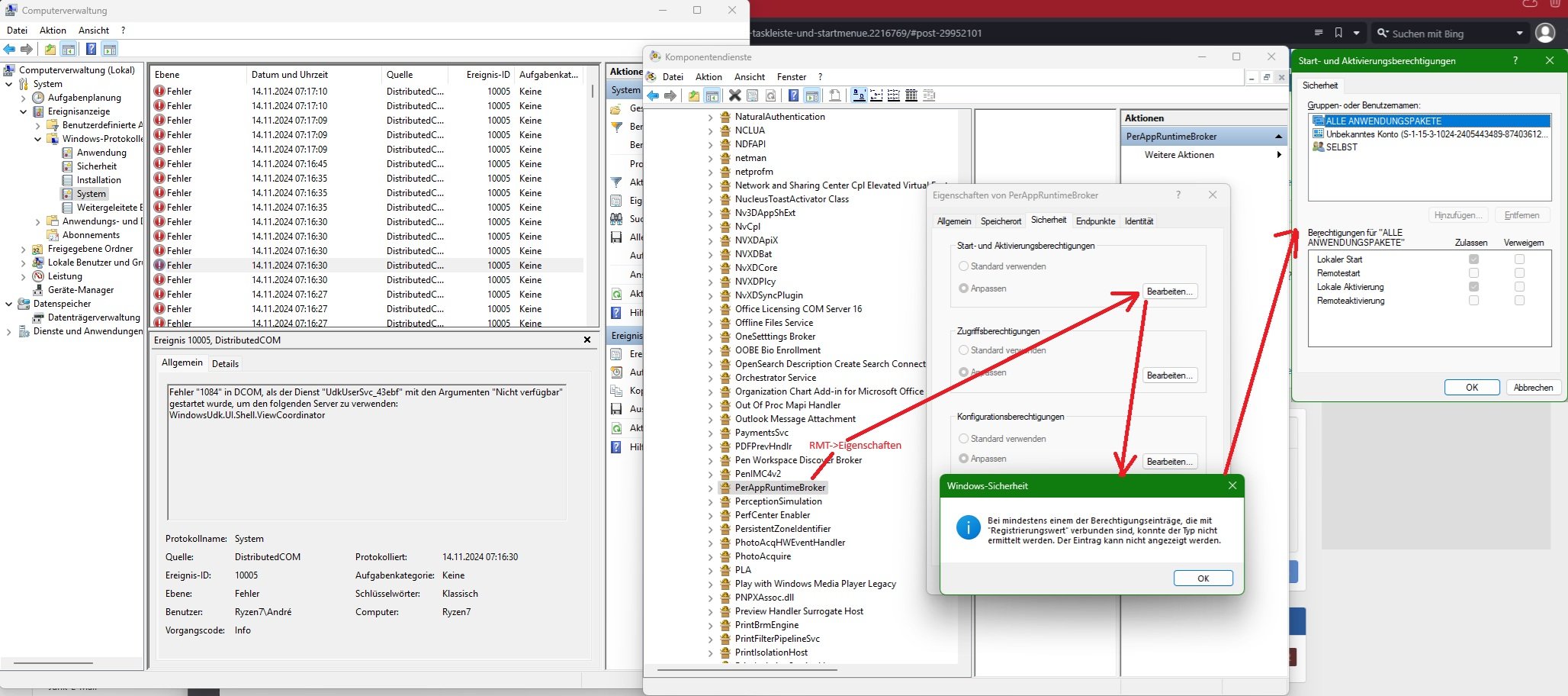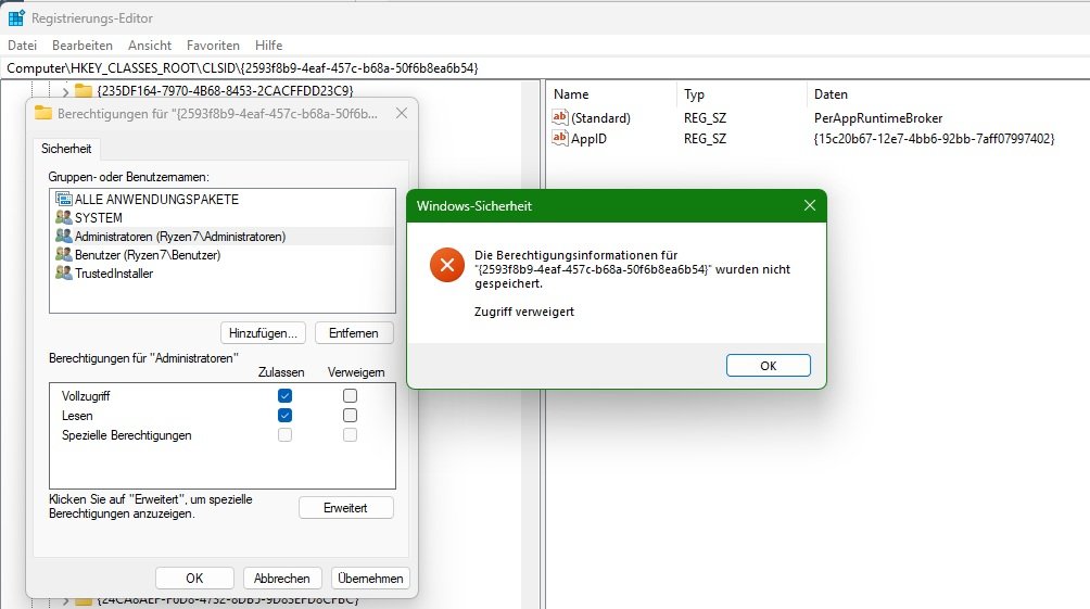 Den PerAppRuntimeBroker konnte ich jetzt meinen Nutzer zuweisen.. dazu musste ich der Registry den Eintrag erstmal in Besitz nehmen und anschließen konnte ich mir selbst Rechte darauf geben. Anschließen konnte ich auch in DCOM Anpassungen machen.