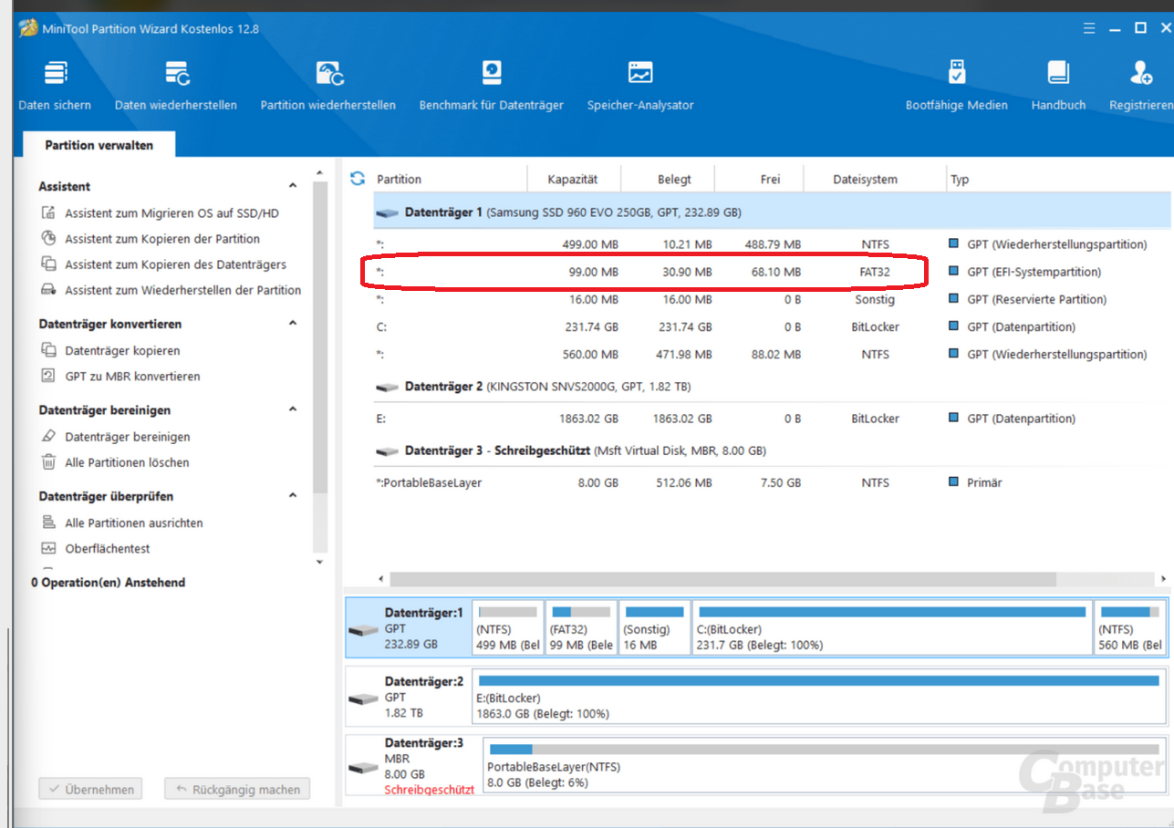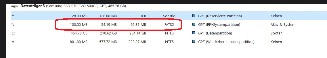 Nach einen Blick auf die Partitionen war lediglich die sonstige GPT Partition mit 128MB am oberen Füllrand.