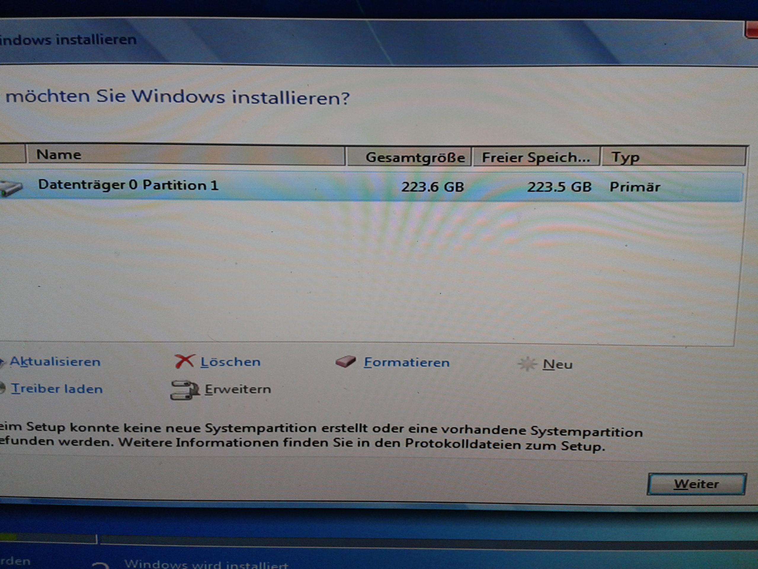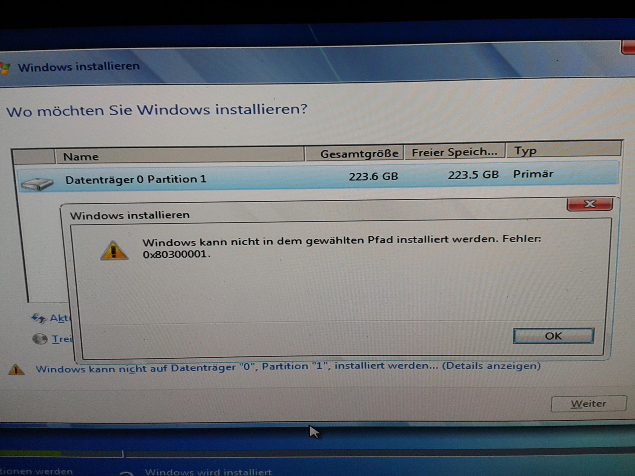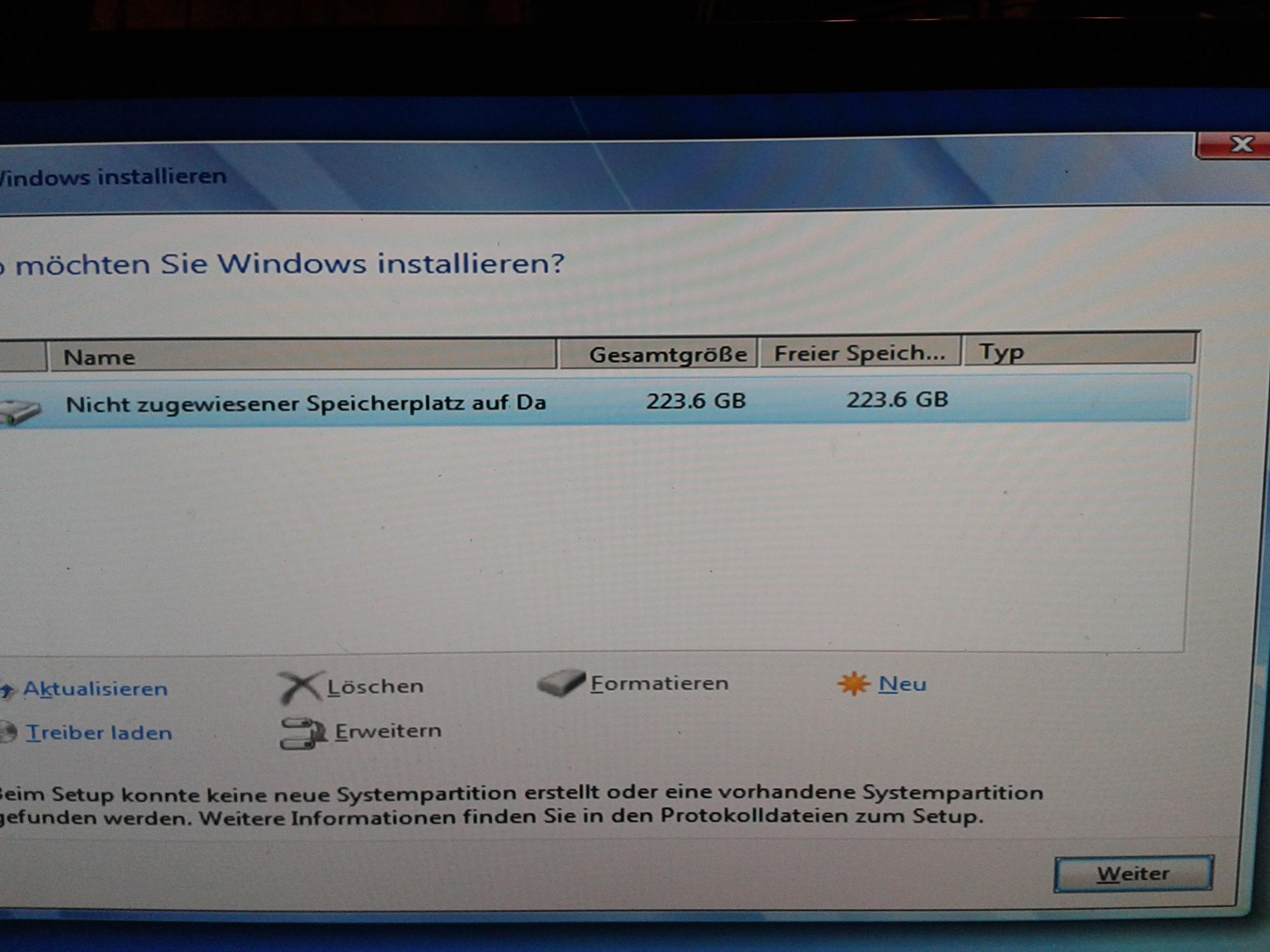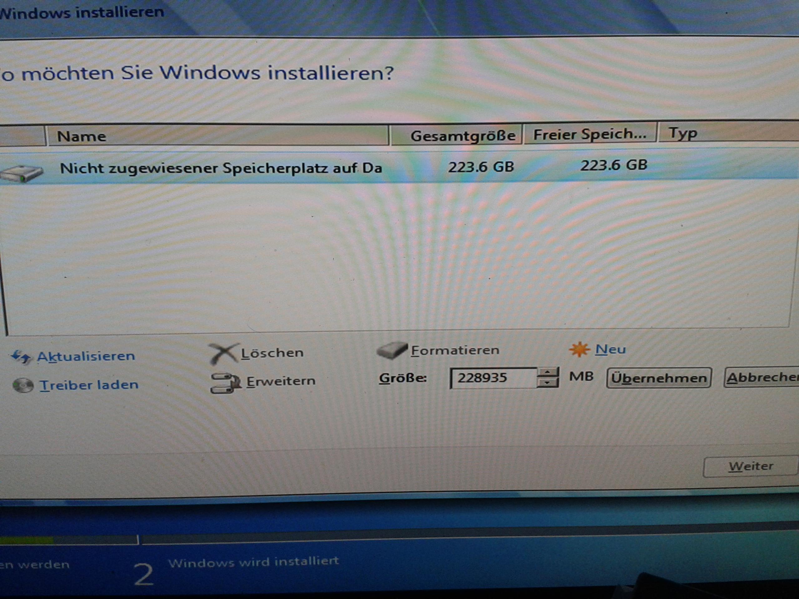 Unpartitionierter Bereich 228 GB vorhanden,Gelöscht,formatiert ,Neu;und bei weiter erscheint obige Meldung.