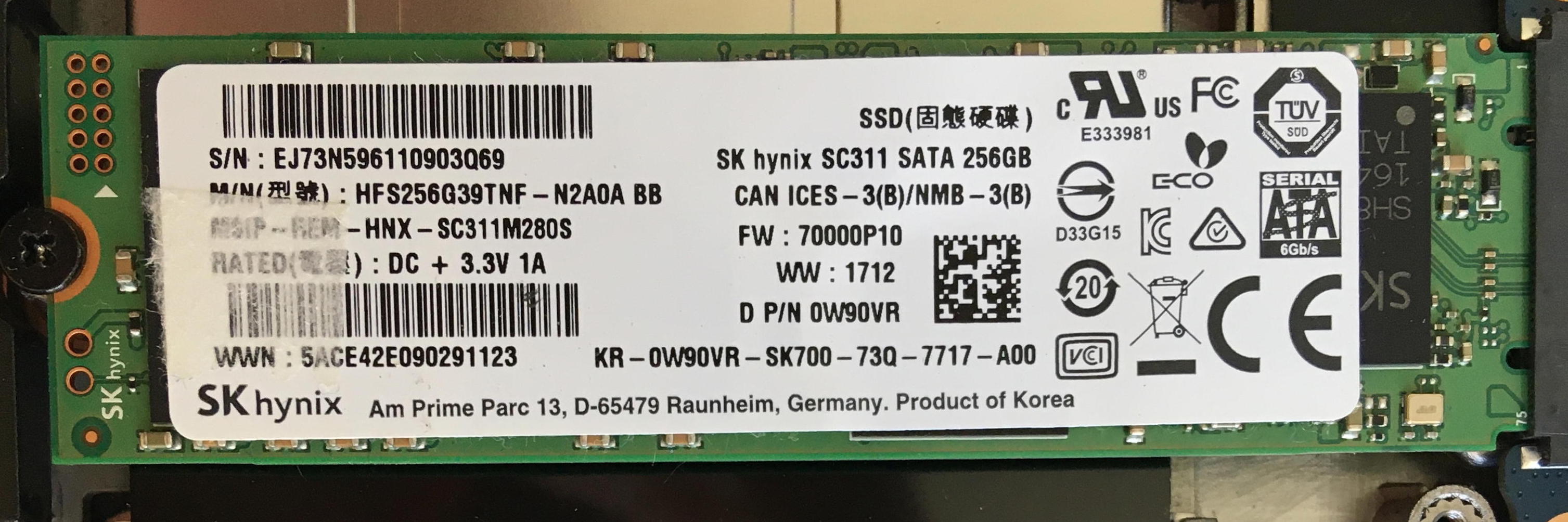 Jetzt weiß ich nicht weiter. Die installierte SSD ist eine Hynix Sata-3 SSD (siehe Bild), wahrscheinlich muss der Treiber jedoch von Intel sein, vielleicht auch der Treiber für die Intel Rapid Storage Technology (Driver_1CM7K_WIN64_17.11.3.1010_A07_06.EXE)?