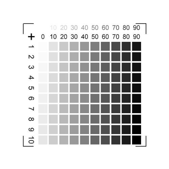 Hinweis: In dem gezeigten Testbild ist nur der Hintergrund vollständig weiß, es gibt kein komplett weißes Kästchen. Alle Kästchen haben eine gewisse Graubstufung. Desweiteren gibt es auch kein vollständig schwarzes Kästchen, selbst das letzte Kästchen in Spalte "90", Reihe "10" ist nicht vollständig schwarz.