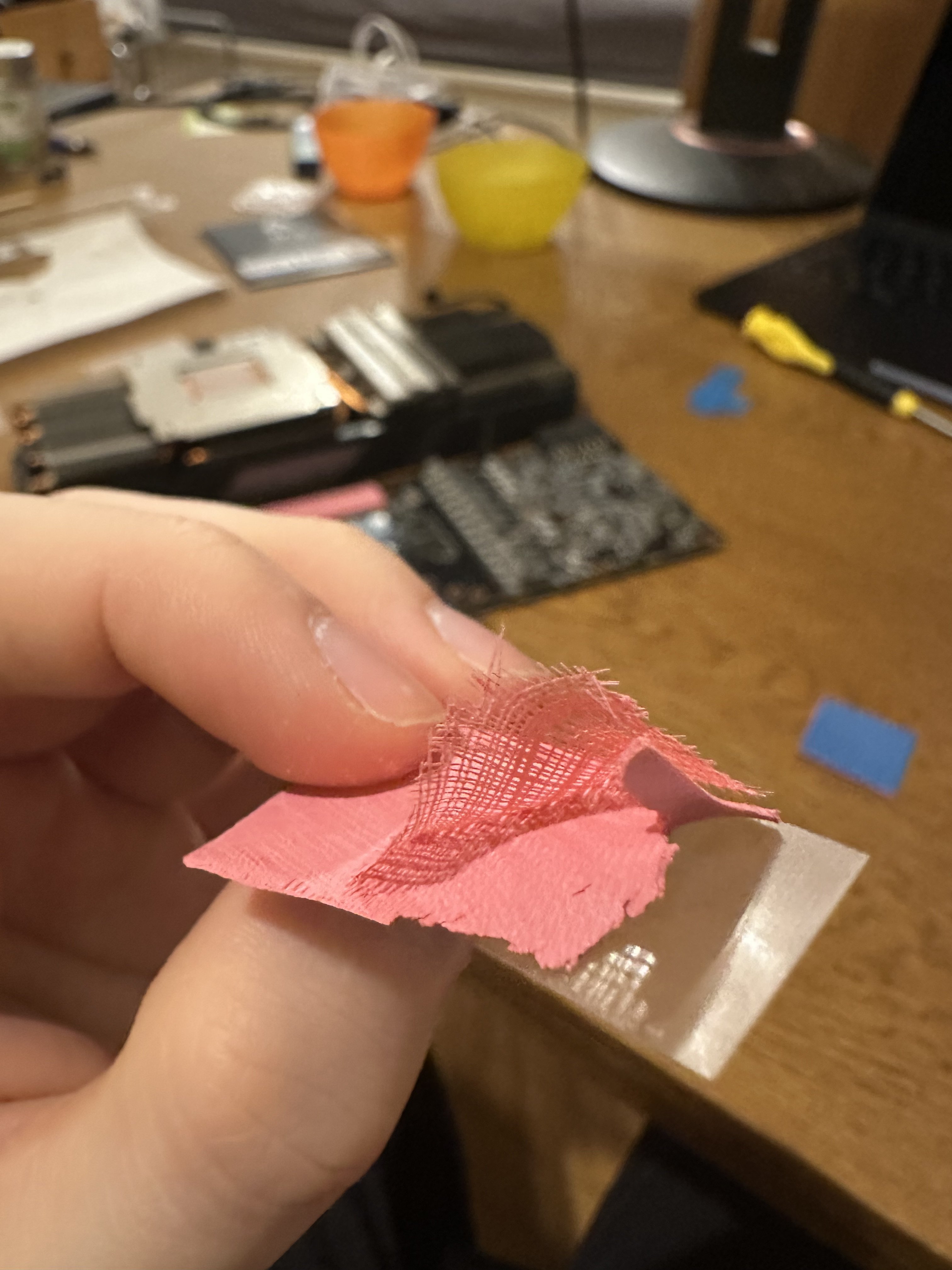 Für die VRAM chips wollte ich vor einem Jahr gekaufte ec360 Gold 100mm*100mm*0,5mm verwenden, jedoch musste ich während der Montage feststellen, dass die, mit blauer Folie bedeckte Seite, teilweise nur leicht klebrig ist und die Struktur der Pads zum Vorschein kommt.
