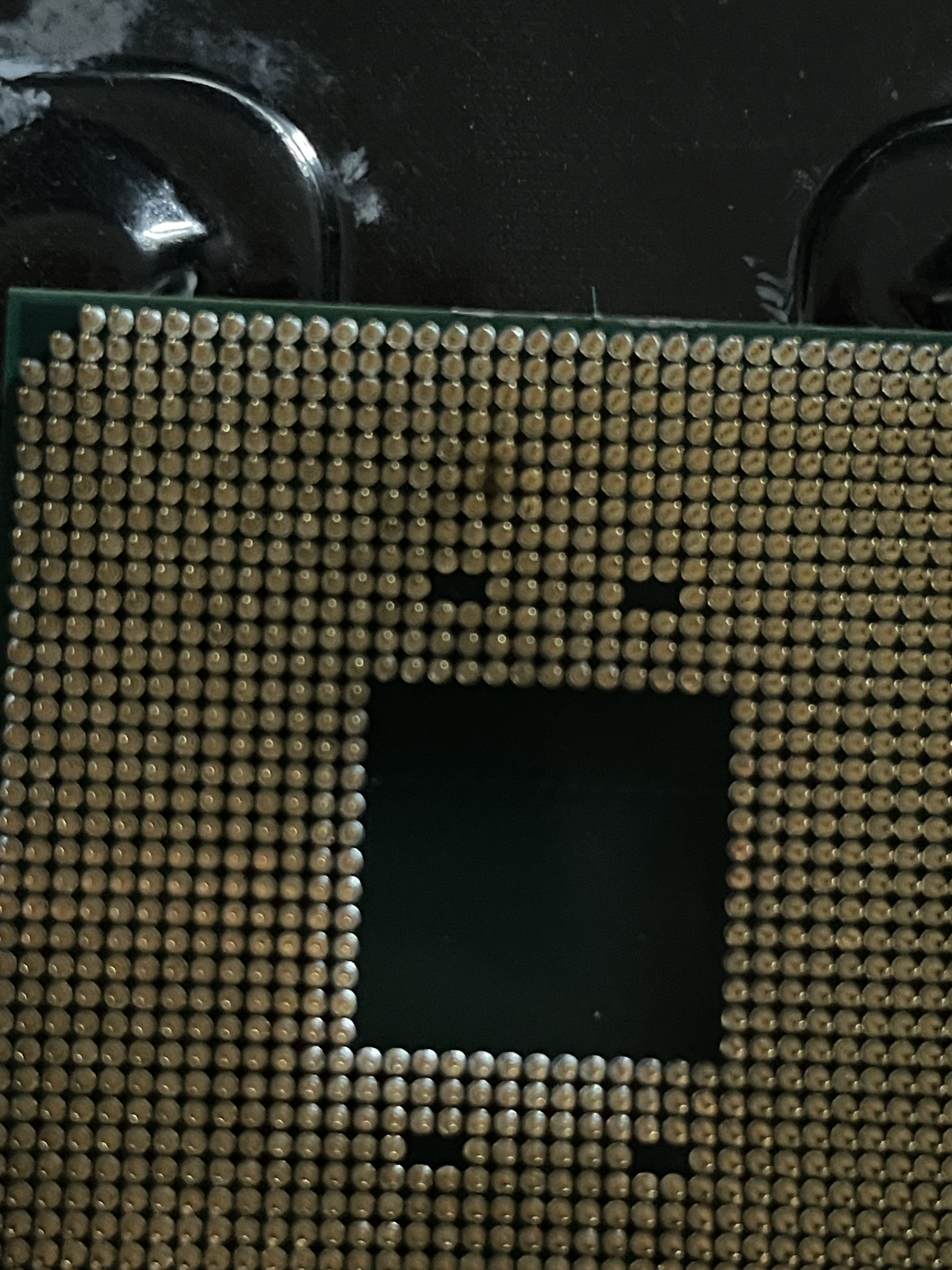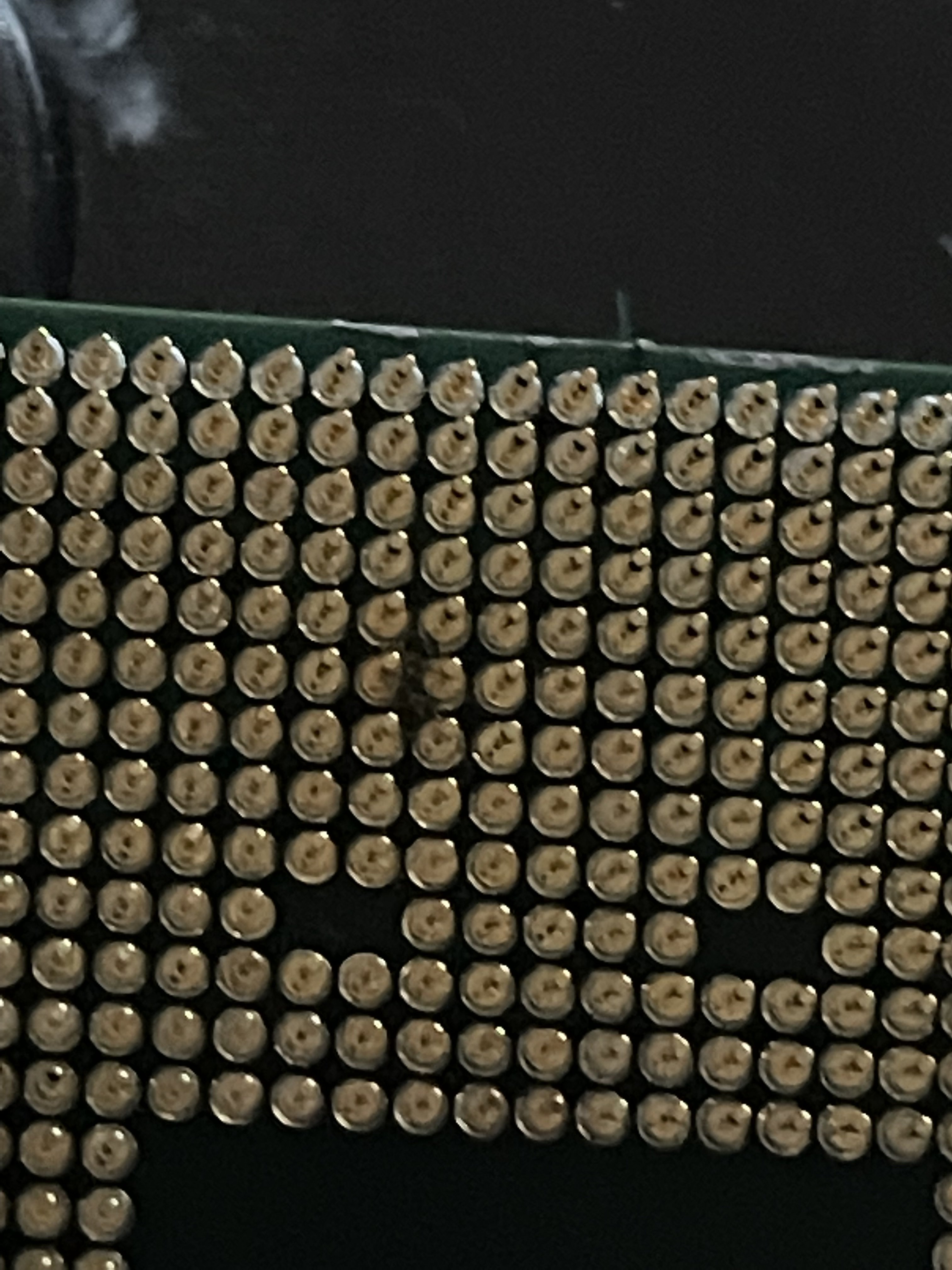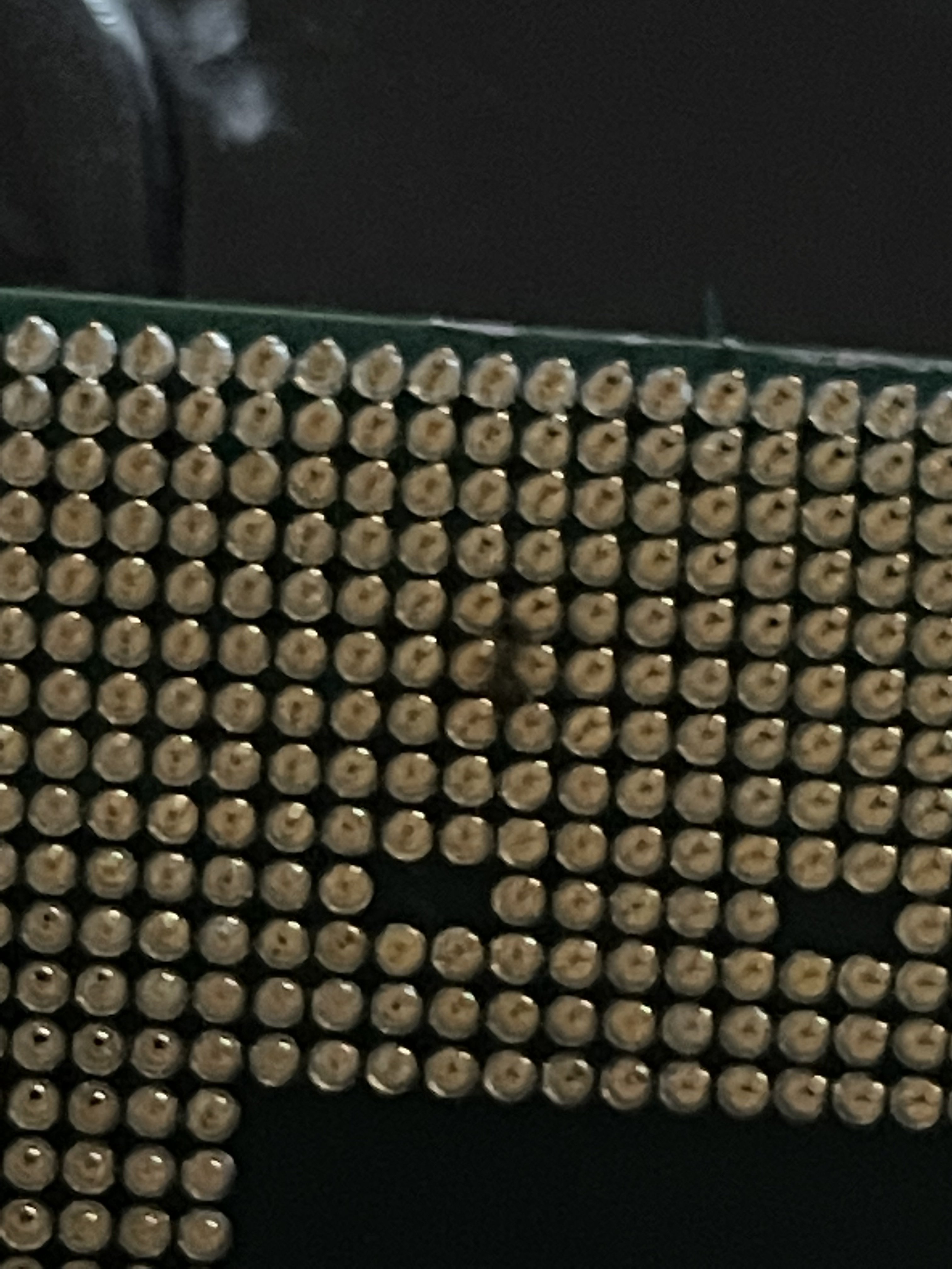 Die Pins der CPU habe ich geprüft, die scheinen alle intakt zu sein, jedoch ist mir eine Stelle an der CPU aufgefallen, die sehr besorgniserregend aussieht. (Sieht Bilder) Ist da was verbrannt? Kann das sein dass wenn die CPU dort durchgebrannt ist, alle meine anderen Komponenten Schaden genommen haben?