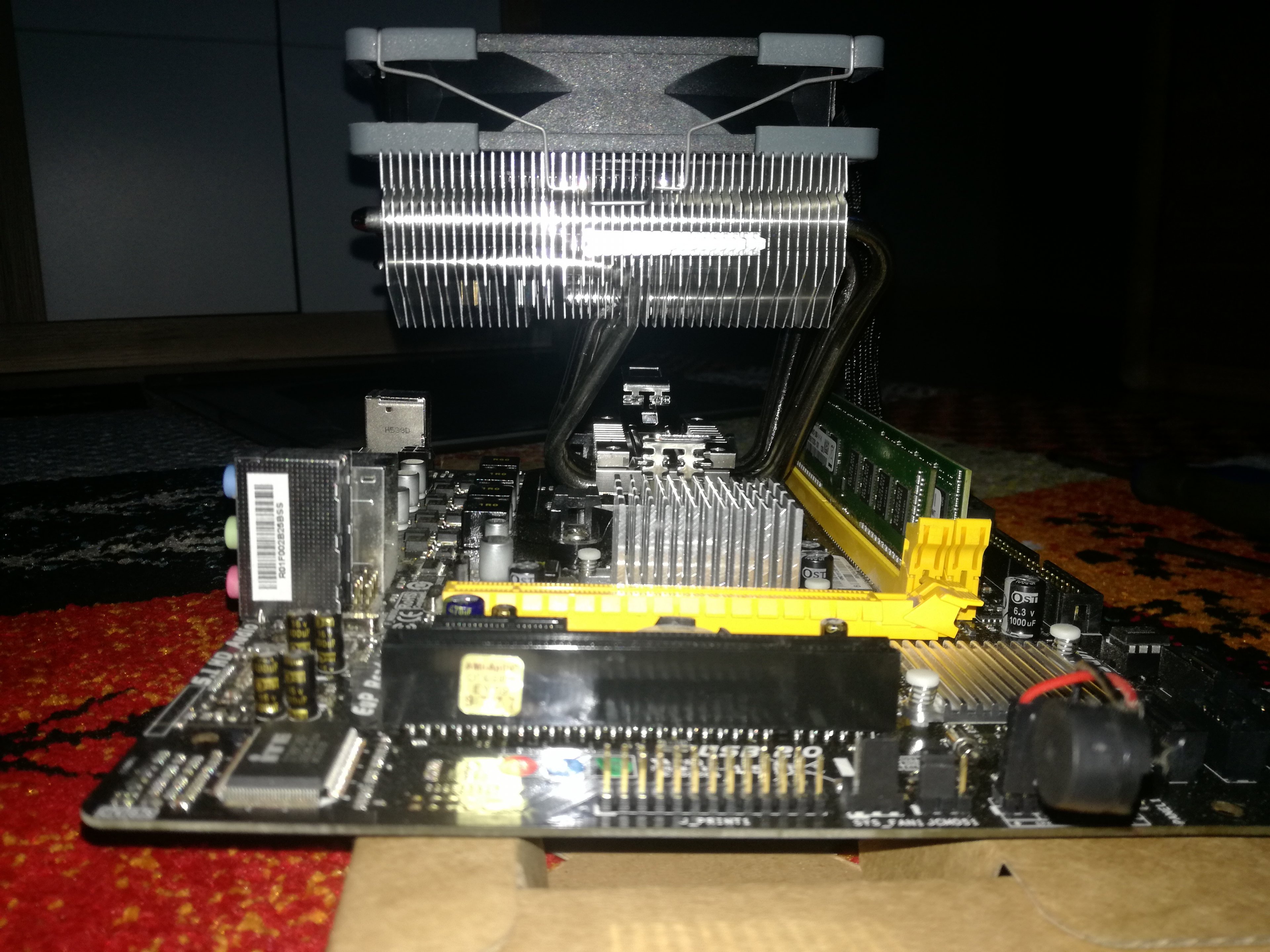 @pepsifreak ich habe doch so klebepad bestellt. Mann ich hab keine andere Möglichkeit das mehr zu kühlen. Hier könnt ihr sehen was für ein kühler das ist. Ihr seht das die CPU rechts ist und der kühler bisschen nach links abragt. Das da drunter sind sie Spannungswandler. Völlig frei. Von ober pustet er die Luft runter und wenn da kleine Rippen sind kann man die besser kühlen.