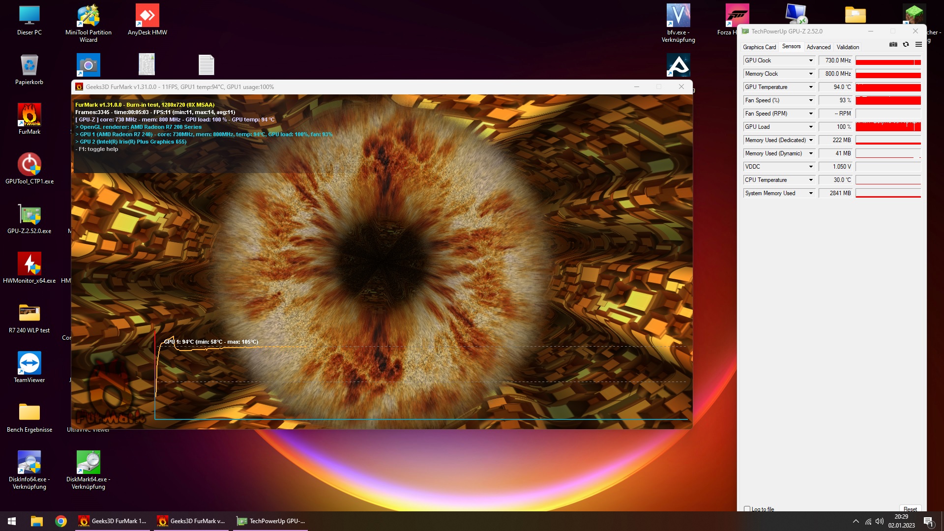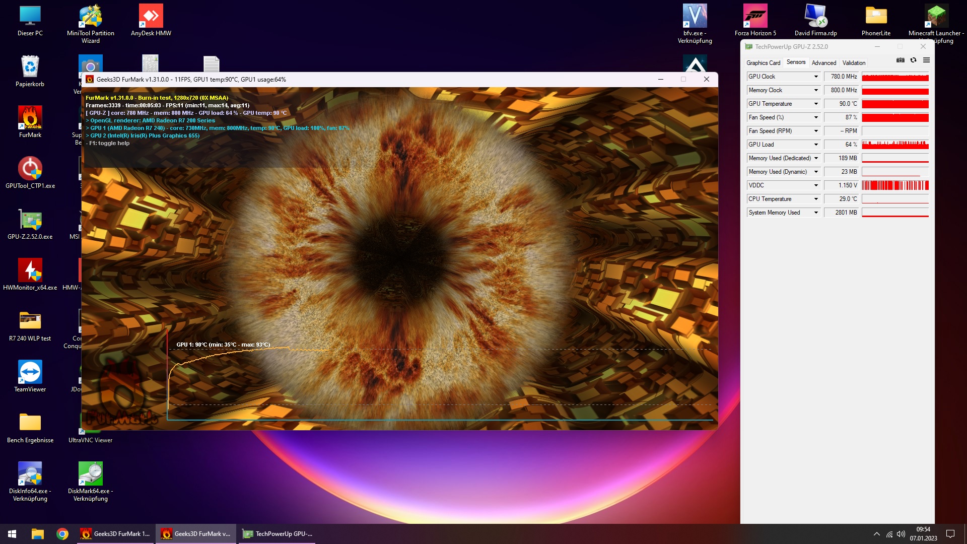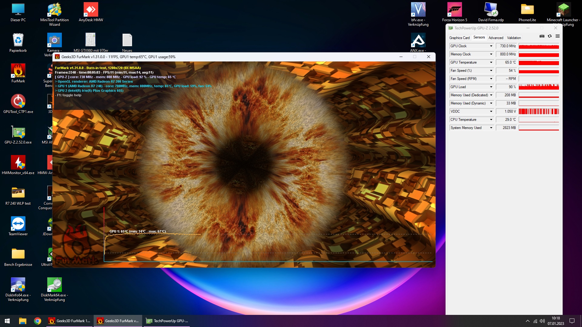 Testobjekt war eine Raden R7-240 mit 30W TDP, getestet wurde immer nur die GPU Temperatur bei 5 minuten Furmark test.