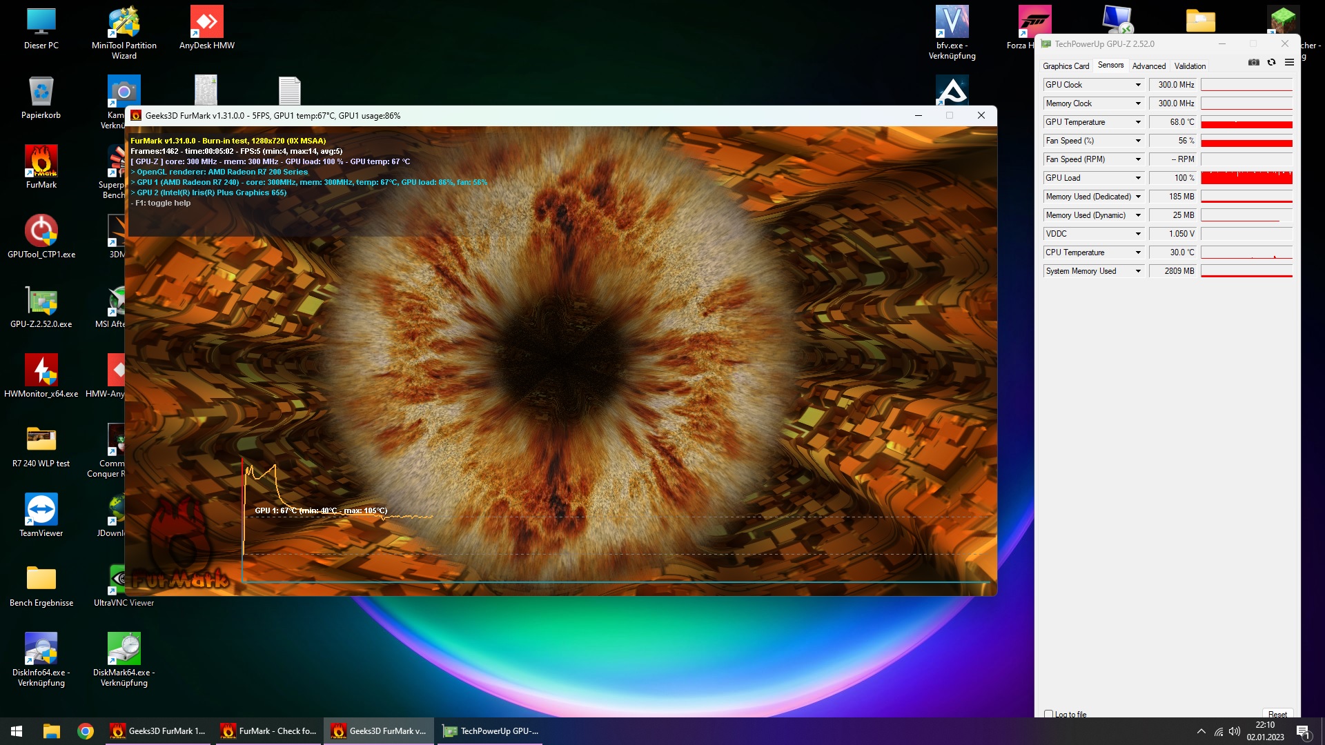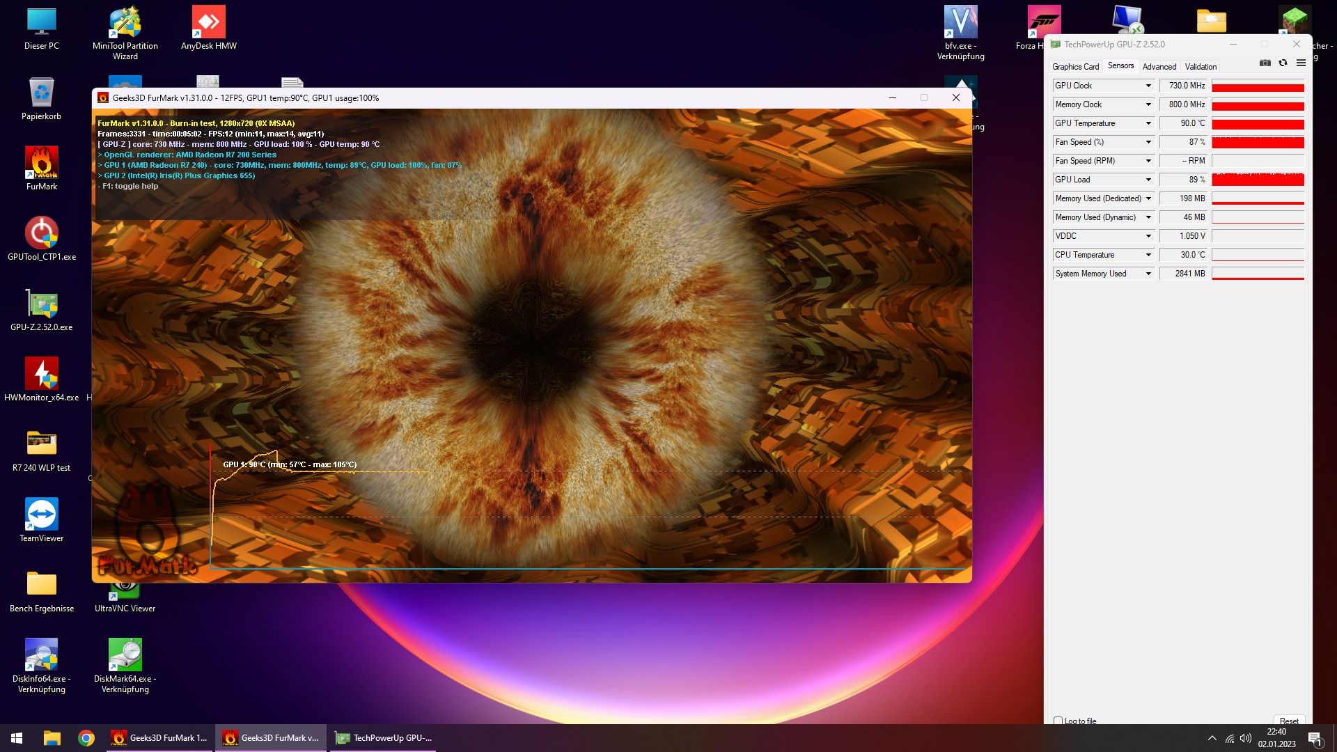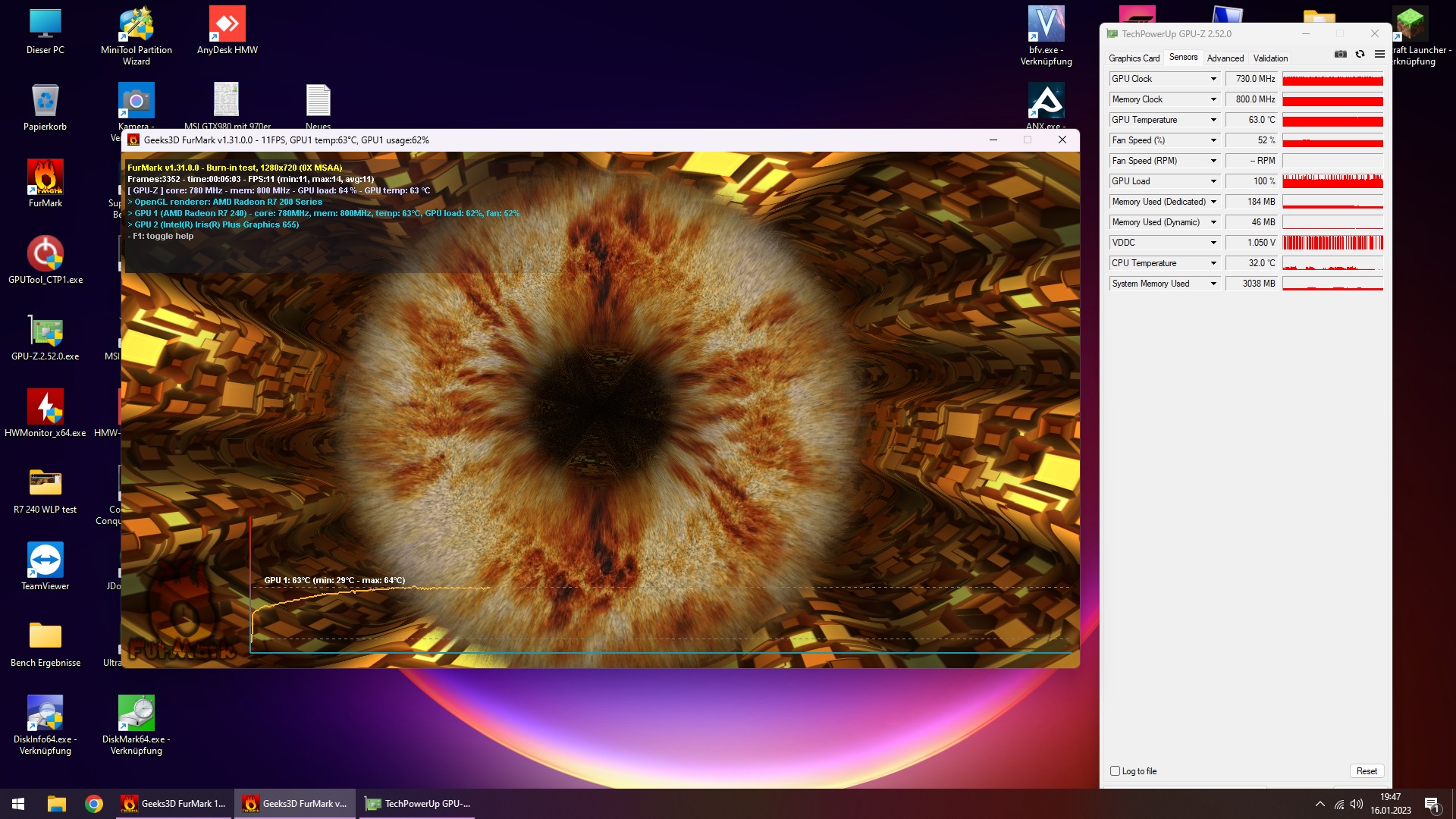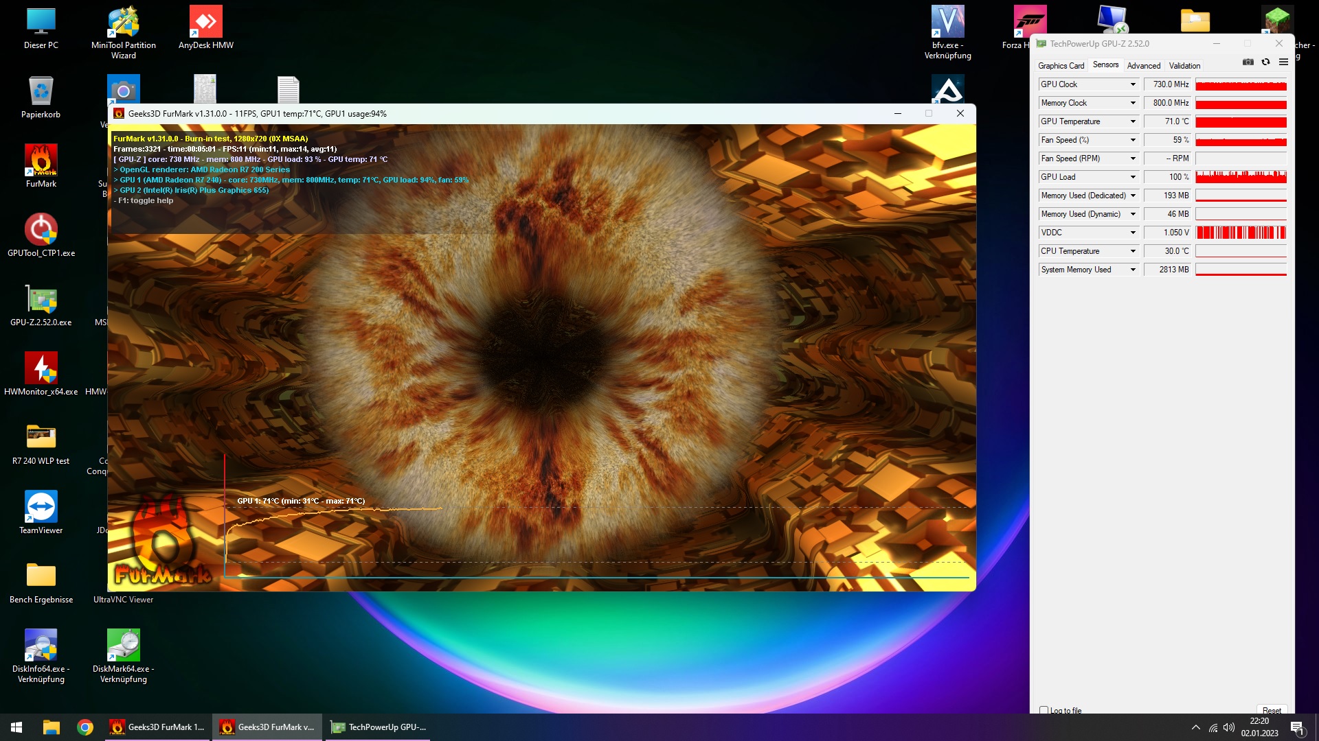 Testobjekt war eine Raden R7-240 mit 30W TDP, getestet wurde immer nur die GPU Temperatur bei 5 minuten Furmark test.