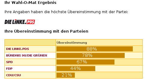 Sorry nur halbernst gemeint - aber ich habe das Tool mit einen Dutzend Kollegen (hauptsächlich CDU- und FDP-Anhänger) durchgetestet. Ein derart klares Ergebnis hinsichtlich der Antwortübereinstimmungen hatte nicht mal mein Cheffe - ein absoluter Hardcore-CDU-Fan.
