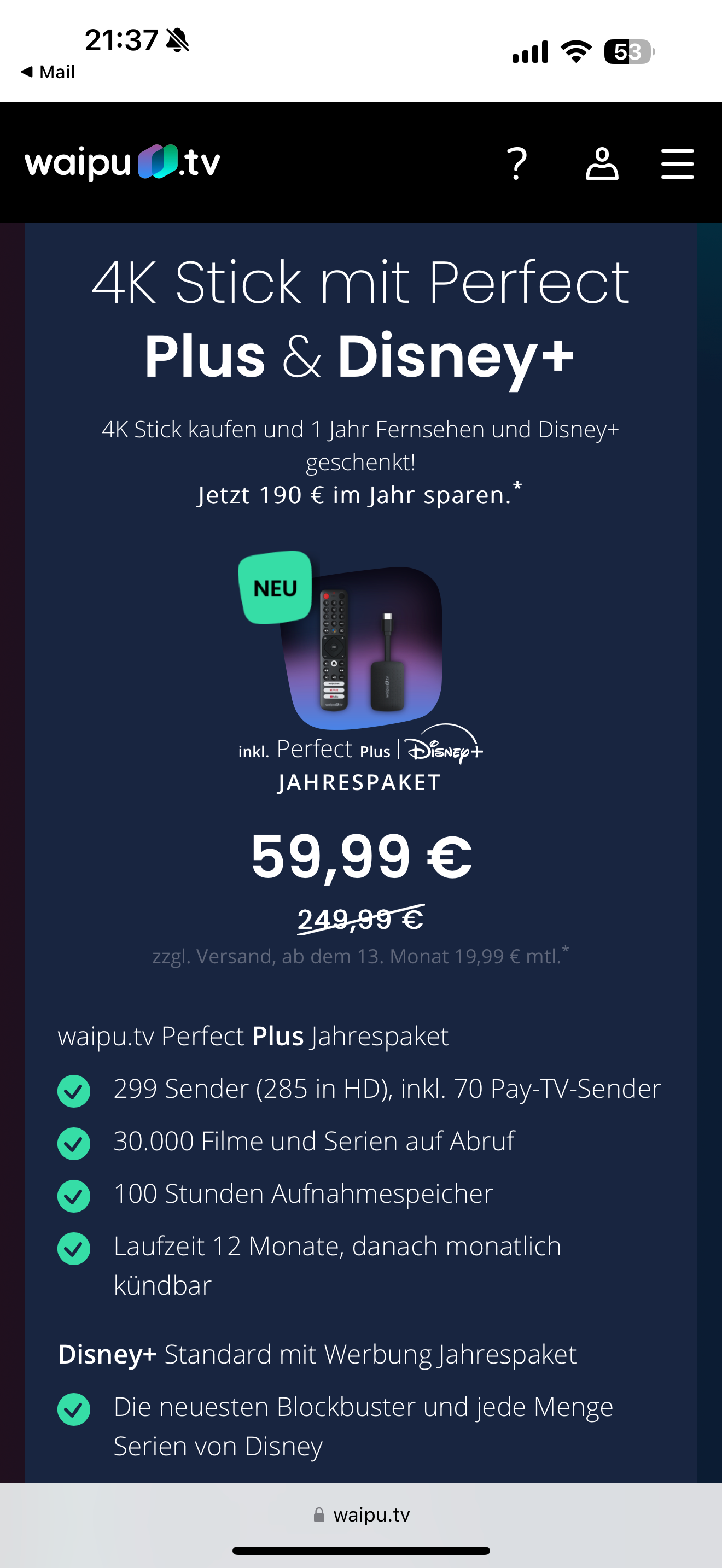 habe mir im Februar einen neuen TV bestellt und bin auf Internet TV umgestiegen. Für mich wurde es WaipuTV Perfect Plus mit Paramount+ und den 4k Stick für 60€ über den gesamten Zeitraum. Da ich nun schon über die Hälfte der Zeit hinter mir habe, stellt sich mir natürlich die Frage, wie es nach dem Jahr aussieht. Wird es darauf hinauslaufen, dass ich dann monatlich die 13€ (im Vergleich zu den jetzigen 5€) berappen muss, oder gibt es andere Möglichkeiten? Falls nicht, wäre ich auch nicht abgeneigt den Anbieter zu wechseln, (o2 TV/Magenta) falls sich das finanziell lohnt. Würde mich interessieren, wie ihr es handhabt und danke schonmal für eure Antworten.