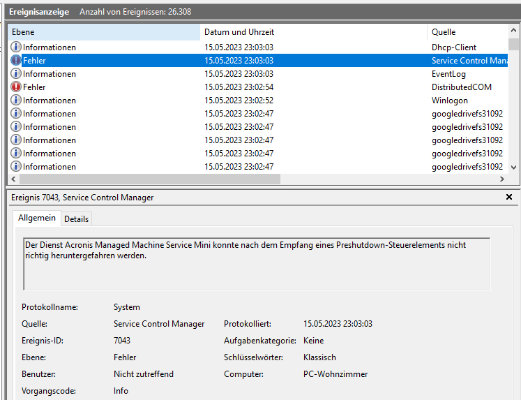 Die Beschreibung für die Ereignis-ID "1" aus der Quelle "googledrivefs31092" wurde nicht gefunden. Entweder ist die Komponente, die dieses Ereignis auslöst, nicht auf dem lokalen Computer installiert, oder die Installation ist beschädigt. Sie können die Komponente auf dem lokalen Computer installieren oder reparieren.