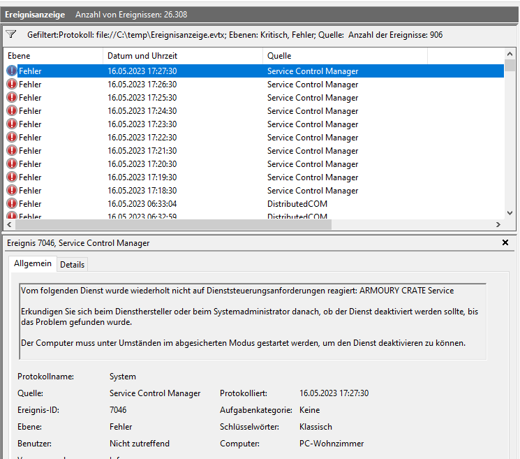 @cartridge_case : Anbei als screenshot die kritischen Ereignisse: (immer der gleiche)