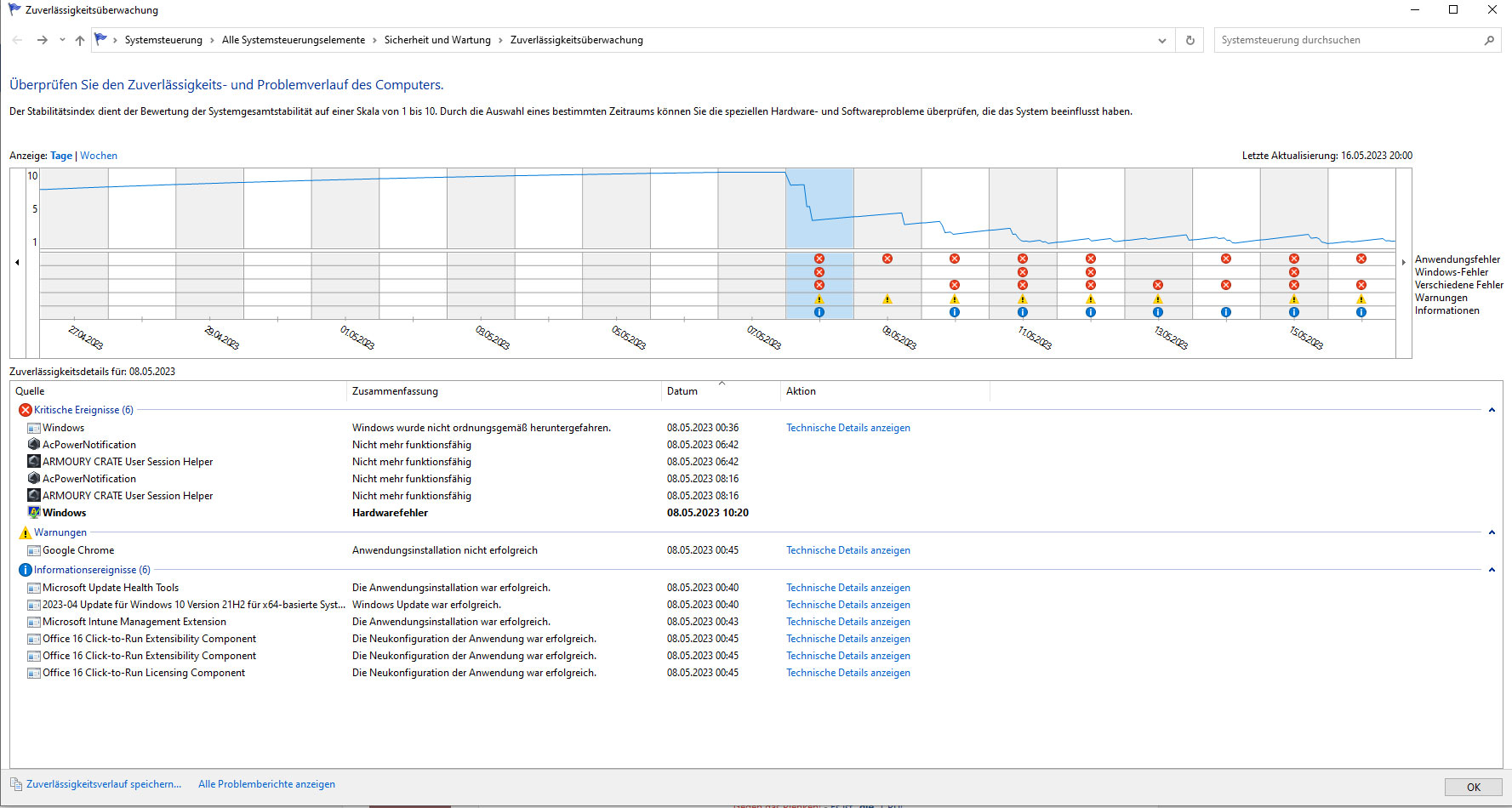 Hier ein screenshot des Zuverlässigkeitsüberwachung (siehe unten)