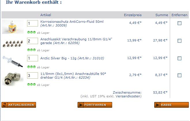 Zusätzlich bräuchte ich natürlich noch 3 Schnellkupplungen, damit ich die Radiatoren abtrennen kann, wenn ich den Rechner mal unterm Schreibtisch hervorziehen muss.