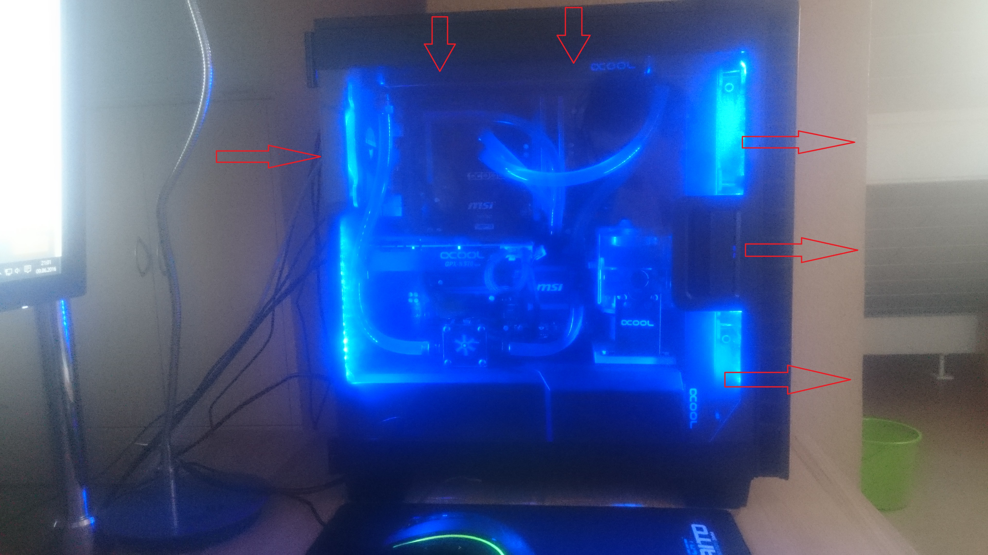 Nun stellt sich die Frage wie ich den Airflow verbessern könnte OHNE die Radis aussen anzubringen ohne großartig etwas herrauszusägen. Gehäuse möchte ich auch nicht wechseln. Oder sind die Temps soweit okay?. Eine Frage am Rande wie könnte ich die LED Beleuchtung verbessern? (mir persönlich gefällt es noch nicht so ganz) Wäre über hilfreiche antworten dankbar.