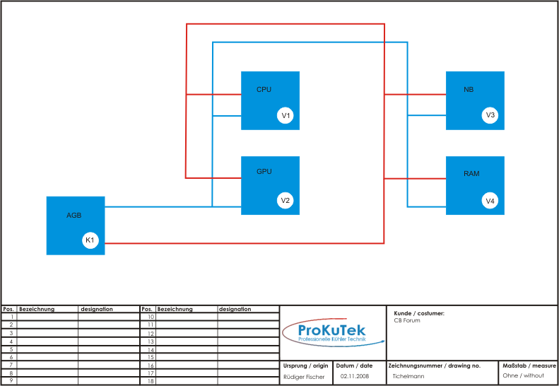 hab mal eine Grafik gemacht, die Tichelman erläutert solange mir hier keiner widerspricht empfehle ich diese art der Verschlauchung, da hier der Gesamt-Fließwiderstand deutlich geringer ist, dh. Pumpe arbeitet weniger und mehr Wasser kann fließen, was kühlere Temperaturen bedeutet. Darüber hinaus bekommen alle Komponenten gleich kühles Wasser und nicht die erste Komponente kühles und die letzte deutlich erwärmtes Wasser.