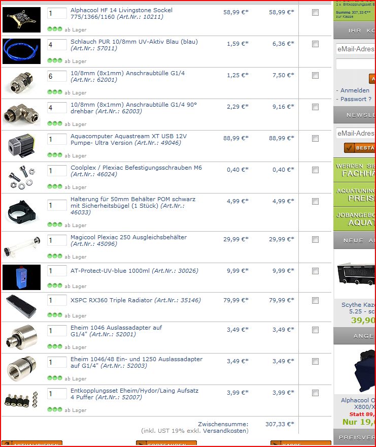 Hallo an alle! Ich möchte mir eine Wakü einbauen und wollte fragen ob meine Zusammenstellung so in Ordnung geht? Preislich möchte ich die 300 nicht überspringen. Ich hoffe das ich nichts vergessen habe für eure Tipps bin ich sehr dankbar!