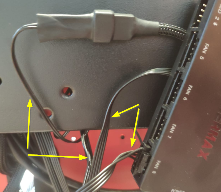 Es sind also keine PWM-Lüfter, geschweige denn gibt es ein Speed-Signal wie bei 3-poligen Lüftern. Deswegen liegt dem Controller eine IR Fernbedienung bei, mit der man die ständig aktiven Lüfter nur minimal in der Drehzahl verstellen kann. Das gefiel mir nicht, weshalb ich das ganze umgebaut habe. Und zwar führen nun 4 Adern zum Controller für die RGB Beleuchtung und 2 Adern zum Mainboard für die DC Lüftersteuerung: