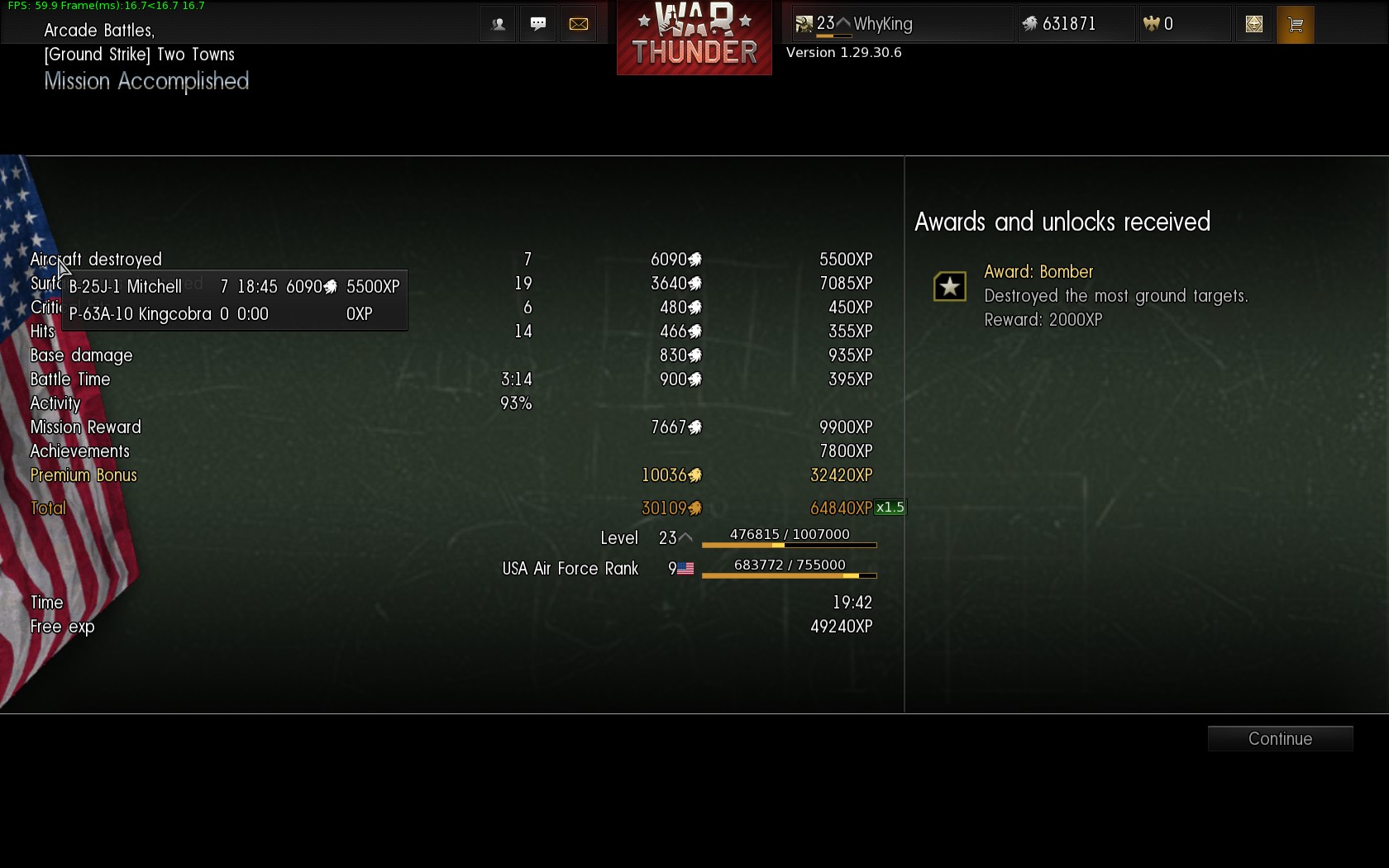 Hatte gestern eine einfach geile Runde. Bin nur die B25 (rank7) geflogen und hab neben 19 ground kills, 3 flugzeuge auf den airfield zerbombt die sich grad reparieren ließen. Dann noch 2 bf109 in einen headon zerlegt und 2 mitm gunner abgeschossen. Was eine lucky runde.