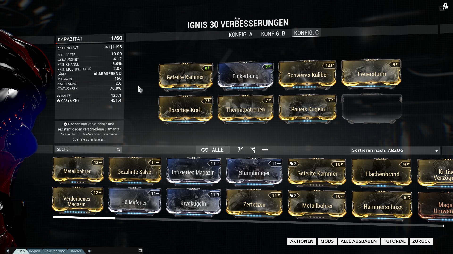 Gibt mMn nichts besseres zum Sporen verteilen als den Ignis. Klappt sehr gut und man macht 'nen Haufen Schaden und Kills, wenn man ordentlich Fähigkeitsreichweite moddet. Natürlich kommt in den Ignis noch unheimliche Ausstreckung rein, aber dafür muss erst wieder formiert werden. Der Gasschaden ist übrigens für Gift-procs gedacht, soll wohl den Damage der Sporen nochmal erhöhen. Allerdings gibt es 2 Probleme mit dem Skill: Die Sporen sind nicht sofort da, wenn die Gegner low-lvl sind, sterben sie meistens bevor man die Sporen-Kettenreaktion starten kann. Und später muss man aufpassen, dass man sich nicht über den Haufen schießen lässt, während man die virale Welle anschubsen will. ^^