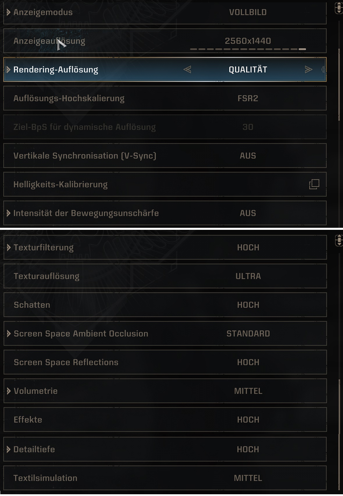 Ich habe etwas experimentiert und denke, dass diese Einstellungen etwas mehr Leistung freigeben und optisch kaum auffallen. Also verglichen mit dem Ultra Profil. Das wäre also meine Empfehlung. Dazu drossle ich meine GPU mit einem anderen Treiberprofil und nutze ein Limit von 60 FPS.