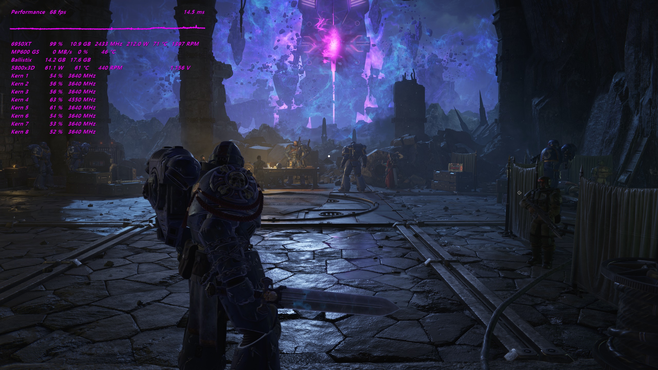 Hier wieder das Ende des Spiels. Einen Screenshot musste ich leider händisch zusammenflicken, da gab es einen Bug bei der Aufnahme. Daten und Szene stimmen aber überein und sind auch korrekt. Was nicht korrekt sein kann, ist die Angabe der VRAM Belegung. Beim 1. Test (siehe Screenshots) wurde die noch glaubwürdig angegeben. Was auch auffällt sind die Unterschiede in der CPU Auslastung. Erkennt man am besten am Stromverbrauch. Teilweise erscheint es logisch, dass bei höheren FPS durch bessere GPU Auslastung die CPU auch wieder nachziehen und mehr berechnen kann, was in höherer Leistungsaufnahme resultieren müsste. Tatsächlich kommt es im Spiel aber vor, dass bei weniger FPS der Verbrauch der CPU höher ist und bei mehr FPS ist es manchmal niedriger. Ausschließlich nach der Regel, dass bei schnellerer GPU die CPU auch wieder mehr Leistung aufnimmt, weil sie mit der GPU mithalten muss, kann man hier also nicht gehen. Außerdem kann es nach dem erneuten Laden eines Speicherstands sein, dass man an der selben Stelle 2-3 FPS mehr als nach längerer Spielzeit hat. Space Marine 2 ist also richtig schön schwer zu messen und zu vergleichen