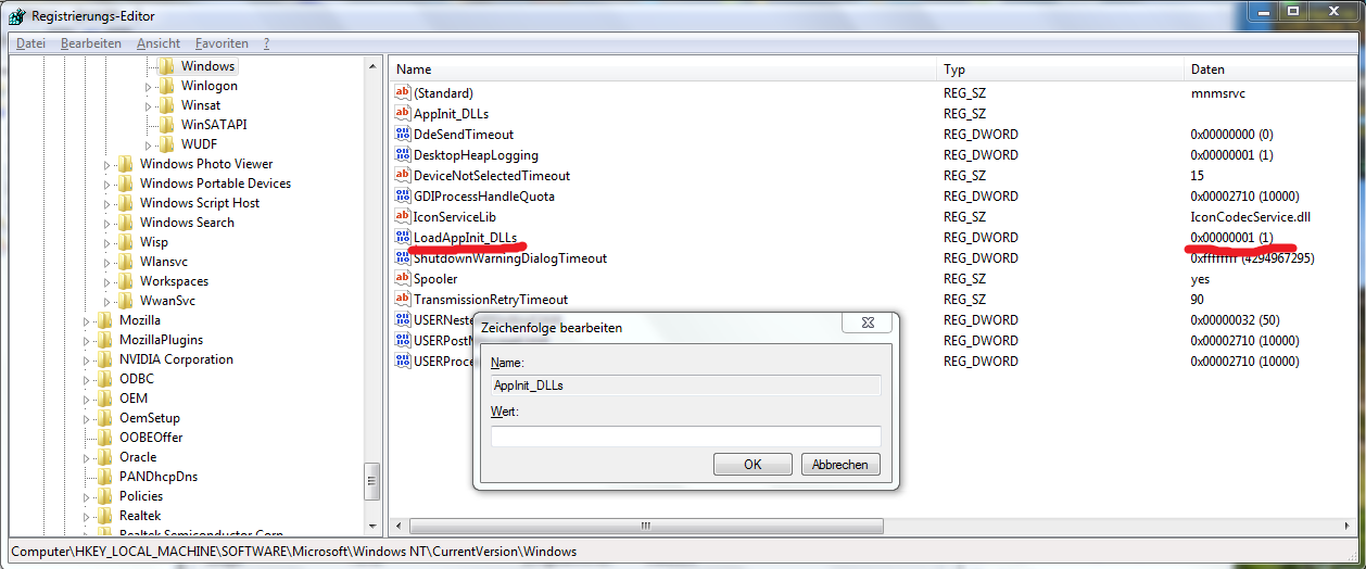HKLM\Software\Microsoft\Windows NT\CurrentVersion\Windows\AppInit_DLL von C:\Windows\System32\nvinitx.dll auf 0 geändert, ebenso