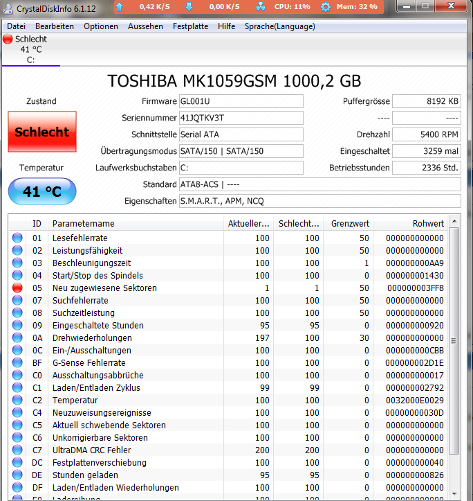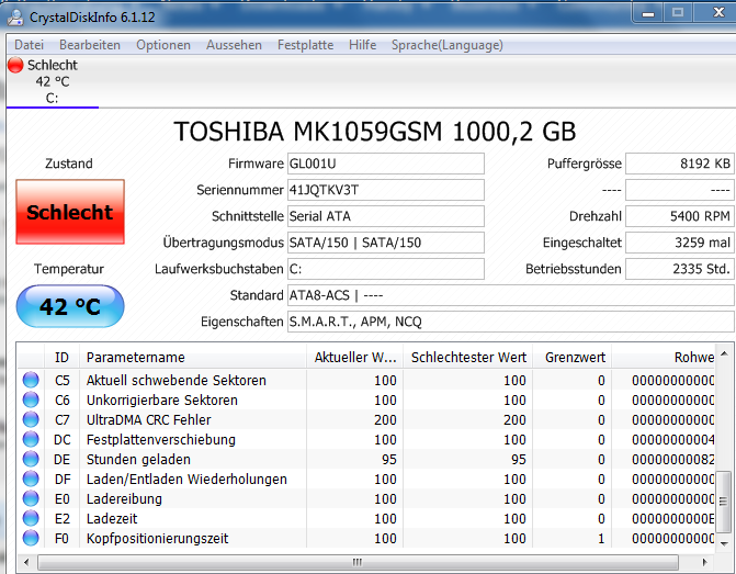 Festplatte auf Anschluss 0: gefährdet"