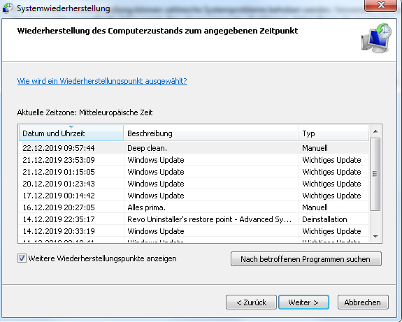 Na, wie auch immer, auf die Punkte vor dem "Deep clean" würde ich sowieso nie zugreifen wollen; außerdem sieht es im Moment sowieso so aus, als werde ich vorerst erst mal sowieso keine Systemwiederh. mehr brauchen.