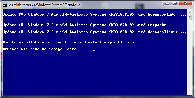 Das Deinstallieren des Packages KB3102810 hat leider nicht wie erwünscht funktioniert. Habe dir ein Script Remove-KB3102810.cmd erstellt, gepackt und das Archiv Remove-KB3102810.zip hier angefügt. Lade dir das Archiv herunter und entpacke es in einen Ordner deiner Wahl. Klicke danach in diesem Ordner mit der rechten Maustaste auf das Script Remove-KB3102810.cmd und wähle im Kontextmenü Als Administrator ausführen aus. Bestätige die Warnung der Benutzerkontensteuerung (UAC) mit einem Klick auf Ja. Es wird dabei das Package KB3102810 heruntergeladen, entpackt und dann die Reste aus deinem System deinstalliert. Bitte schließe das Script nach Fertigstellung indem du die Enter-Taste betätigst wenn du den Satz: "Die Deinstallation wird nach einem Neustart abgeschlossen." siehst, damit wird Windows 7 gleich neu gestartet um die Änderungen zu übernehmen.