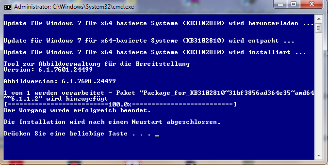 Einen Versuch möchte ich aber dennoch starten indem wir das genannte Package neu installieren. Dazu habe ich dir das Script Add-Package_KB3102810.cmd erstellt, gepackt und das Archiv Add-Package_KB3102810.zip hier angefügt. Lade dir das Archiv herunter und entpacke es in einen Ordner deiner Wahl. Klicke danach in diesem Ordner mit der rechten Maustaste auf das Script Add-Package_KB3102810.cmd und wähle im Kontextmenü Als Administrator ausführen aus. Bestätige die Warnung der Benutzerkontensteuerung (UAC) mit einem Klick auf Ja. Bitte schließe das Script nach Fertigstellung indem du die Enter-Taste betätigst wenn du den Satz: "Die Deinstallation wird nach einem Neustart abgeschlossen." siehst, damit wird Windows 7 gleich neu gestartet um die Änderungen zu übernehmen.