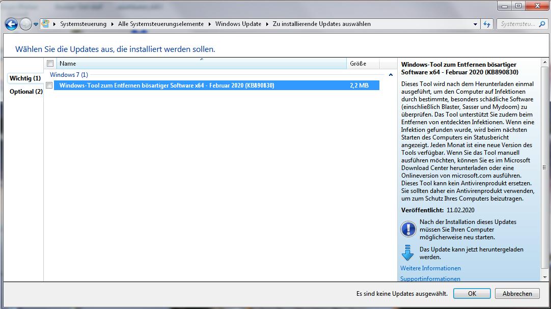 Was mich aber sehr wundert: Wieso gibt es eigentlich angesichts des Endes des Win7-Supports am 14.01.2020 dennoch für Februar(!) 2020 diesen monatlichen Klassiker zum Entfernen von bösartiger Software (KB890830)??