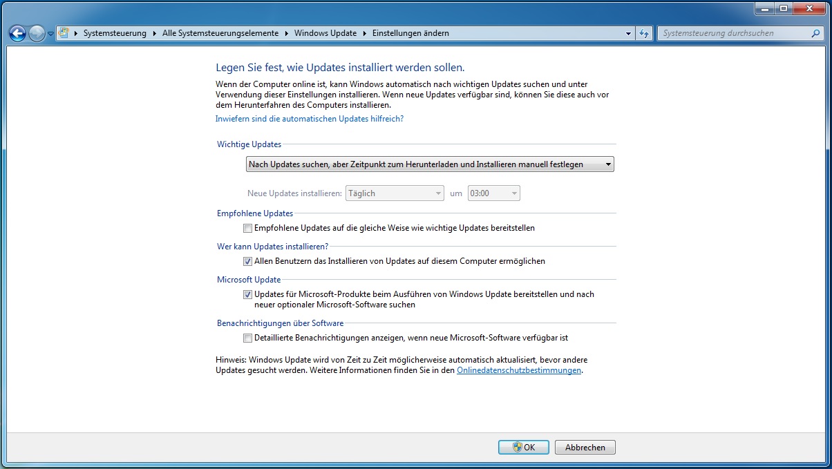 scorpion68 schrieb:Starte Windows 7 danach neu damit die Änderungen übernommen werden. Sollten die Einstellungen bei dir bereits schon so lauten dann führe bitte gleich eine Suche nach Updates durch und mache jeweils von wichtige und optionale Updates einen aussagefähigen Screenshot und füge diese an deine nächste Antwort an. Installiere bitte vorerst noch keine angebotenen Updates!