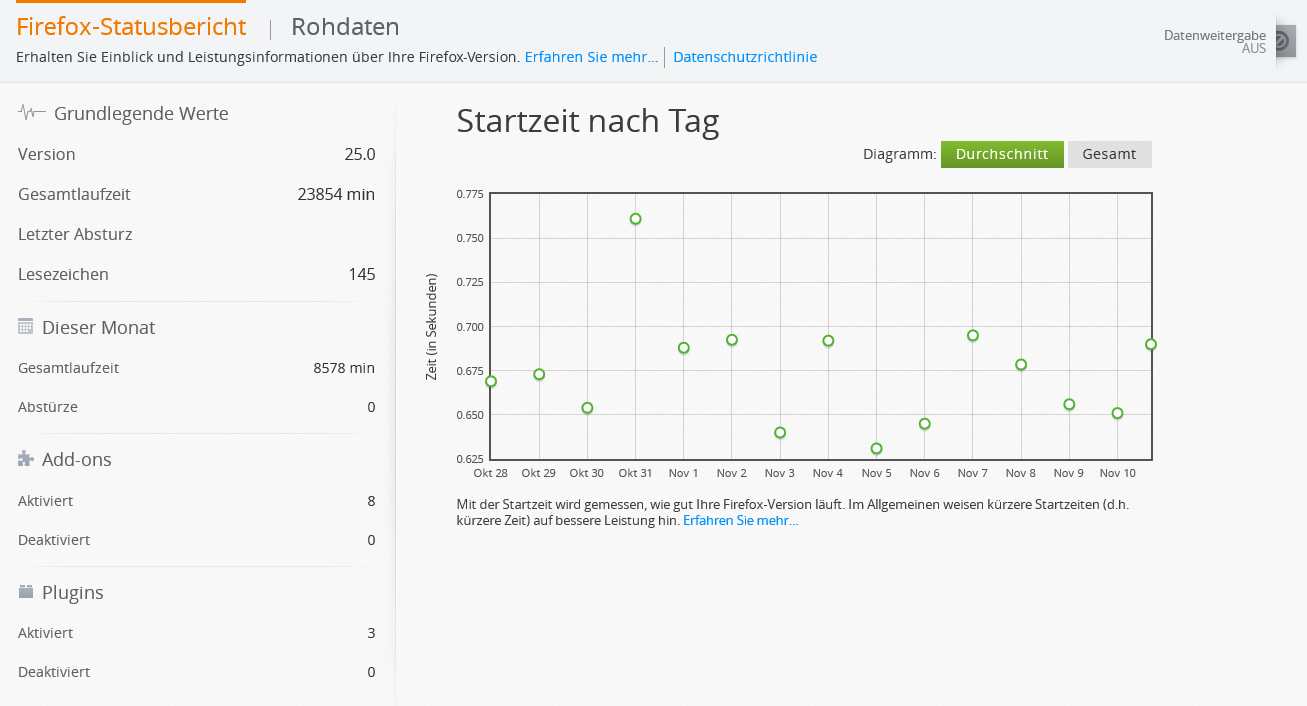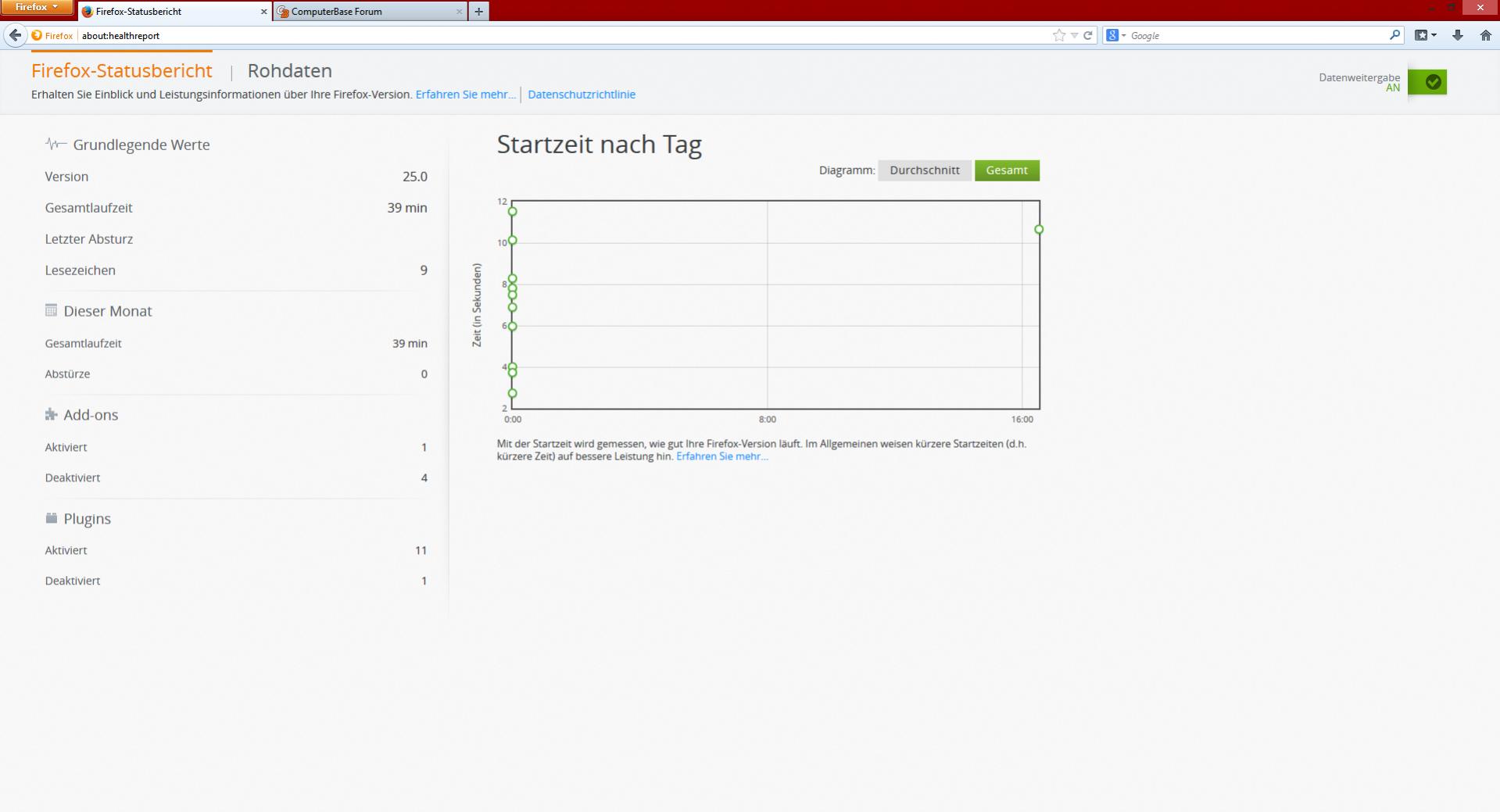 Firefox auf meinem Ultrabook braucht sehr lange zum Starten. Ich kenne auch den Grund: AdBlock Plus. Doch verstehe ich nicht, warum es auf meinem Ultrabook so lange dauert, auf meinem PC hingegen schnell geht. Die Daten vom Ultrabook sind eigentlich nicht so schlecht: