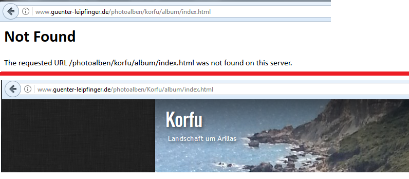 Hallo, auf meiner Hompage (www.guenter-leipfinger.de) befindet sich u.a. ein Beitrag mit dem Namen 'Photoalben'. Der Aufruf der einzelnen Alben klappt bis auf das Album 'Korfu'.
